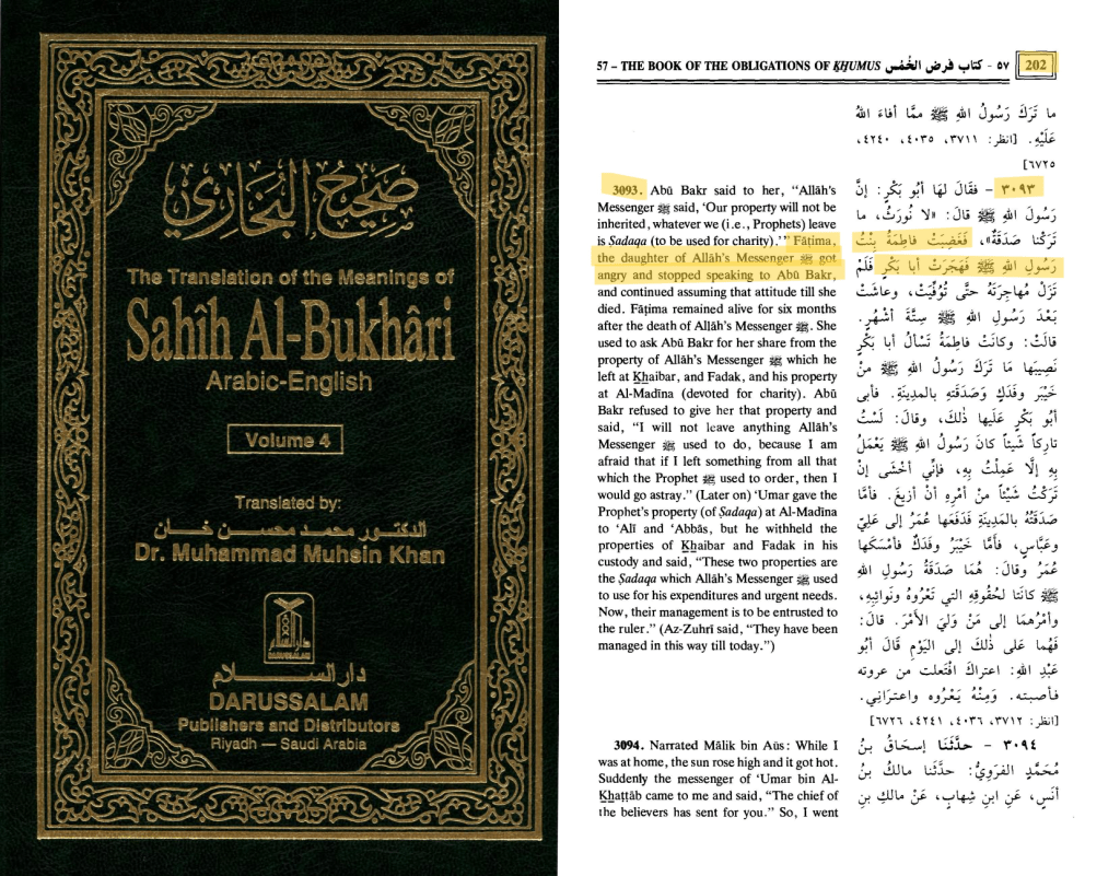 عَنِ ابْنِ شِهَابٍ، قَالَ أَخْبَرَنِي عُرْوَةُ بْنُ الزُّبَيْرِ، أَنَّ عَائِشَةَ أُمَّ الْمُؤْمِنِينَ ـ رضى الله عنها ـ أَخْبَرَتْهُ أَنَّ فَاطِمَةَ ـ عَلَيْهَا السَّلاَمُ ـ ابْنَةَ رَسُولِ اللَّهِ صلى الله عليه وسلم سَأَلَتْ أَبَا بَكْرٍ الصِّدِّيقَ بَعْدَ وَفَاةِ رَسُولِ اللَّهِ صلى الله عليه وسلم أَنْ يَقْسِمَ لَهَا مِيرَاثَهَا، مَا تَرَكَ رَسُولُ اللَّهِ صلى الله عليه وسلم مِمَّا أَفَاءَ اللَّهُ عَلَيْهِ. فَقَالَ لَهَا أَبُو بَكْرٍ إِنَّ رَسُولَ اللَّهِ صلى الله عليه وسلم قَالَ “ لاَ نُورَثُ مَا تَرَكْنَا صَدَقَةٌ ”. فَغَضِبَتْ فَاطِمَةُ بِنْتُ رَسُولِ اللَّهِ صلى الله عليه وسلم فَهَجَرَتْ أَبَا بَكْرٍ، فَلَمْ تَزَلْ مُهَاجِرَتَهُ حَتَّى تُوُفِّيَتْ