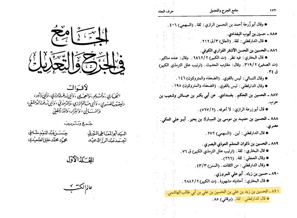 • The Emir al-Mu’meenin fee al-Hadith of the Sunnis, al-Daraqutni was asked about al-Husayn Ibn Zayd Ibn Ali, He said : He is Thiqah (Trustworthy)