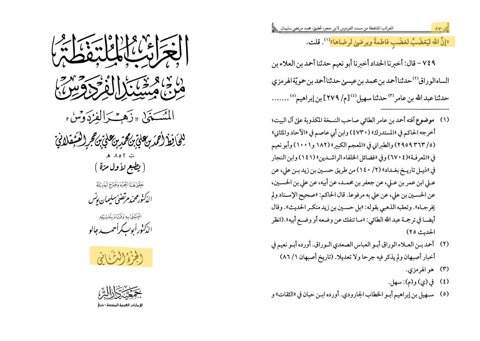 أخبرنا سليمان الحافظ حدثنا أحمد سنان الواسطي حدثنا عبد الله [بن محمد] بن إسحاق حدثنا عبد الله بن أحمد بن عامر الطائي حدثنا أبي حدثنا علي ابن موسى بن جعفر عن أبيه حدثني [أبي حدثنا أبي: محمد بن علي] حدثني أبي حدثني أبي: الحسين بن علي حدثني أبي: علي بن أبي طالب قال: قال رسول الله ﷺ إنَّ الله ليَغضَبُ لغضَبِ فاطمةَ ويرضى لرضاها