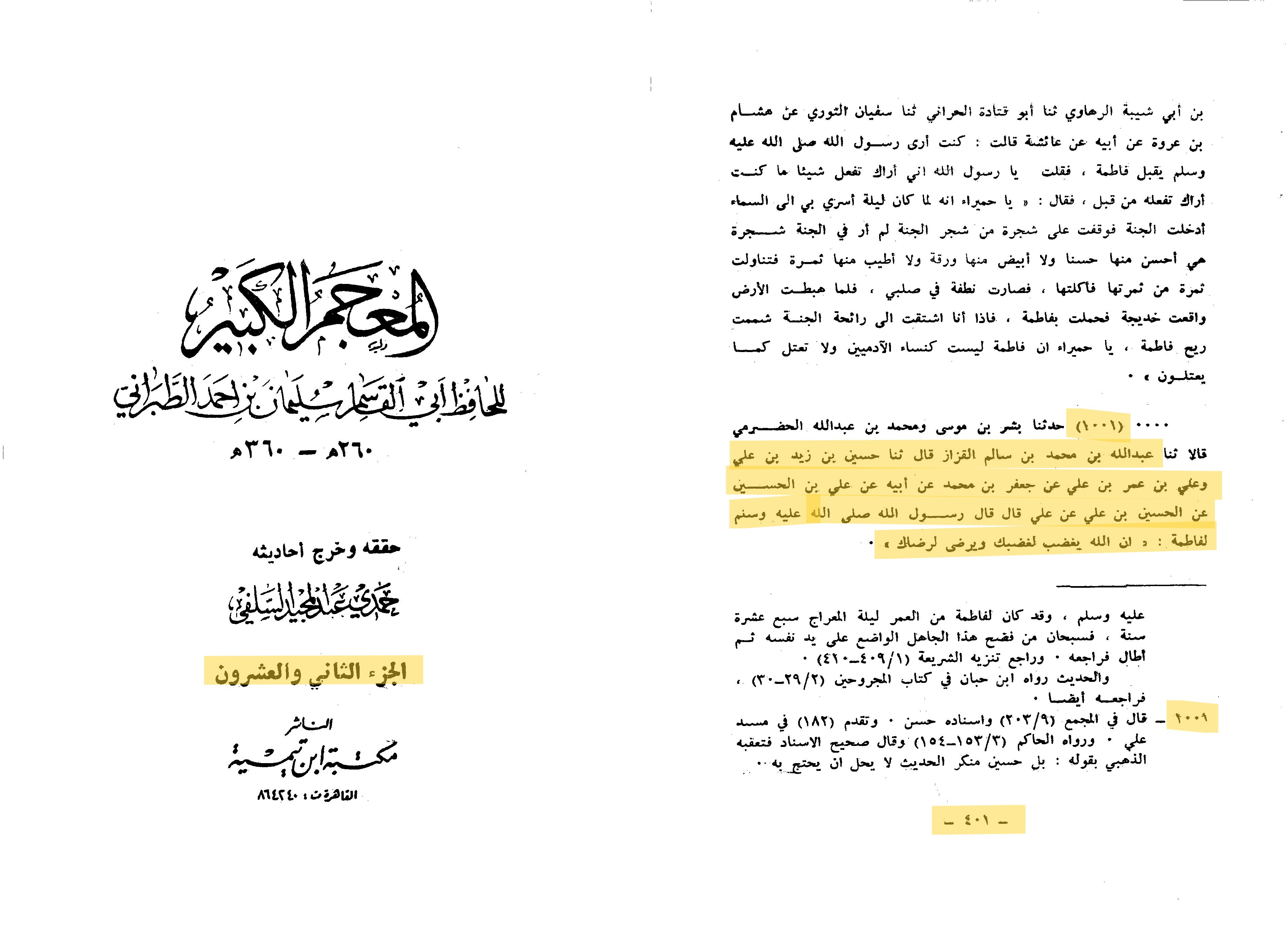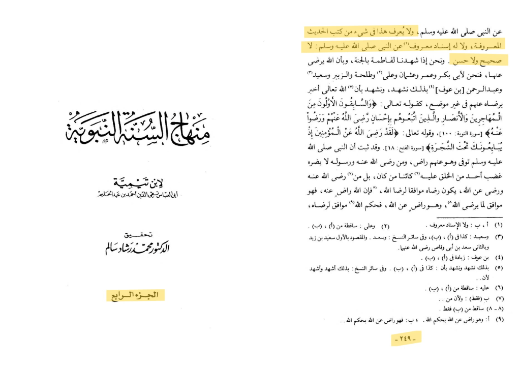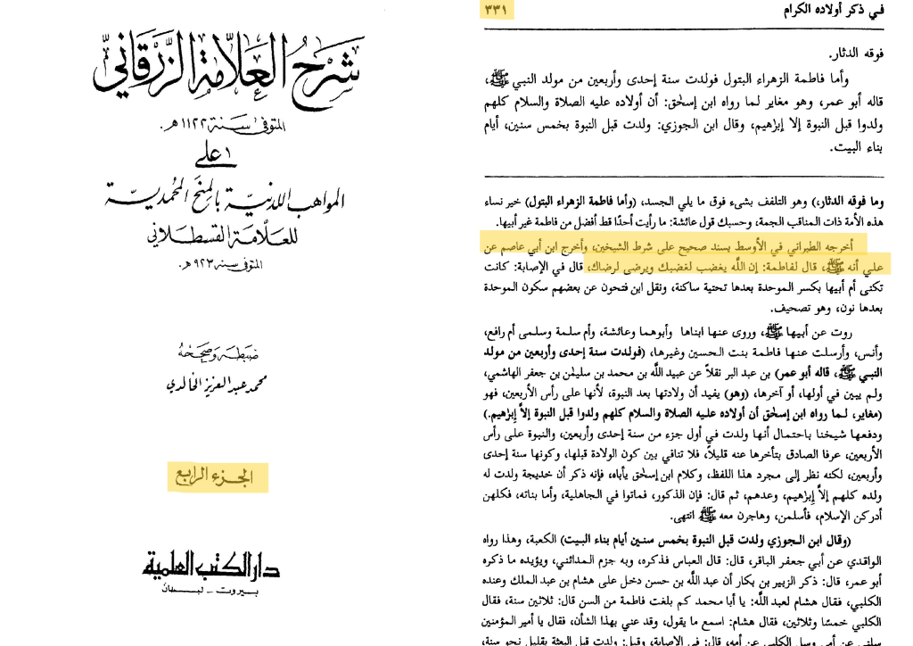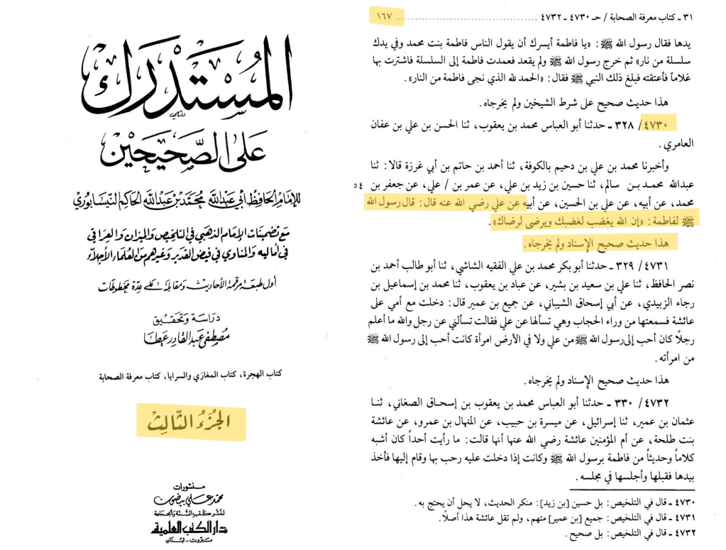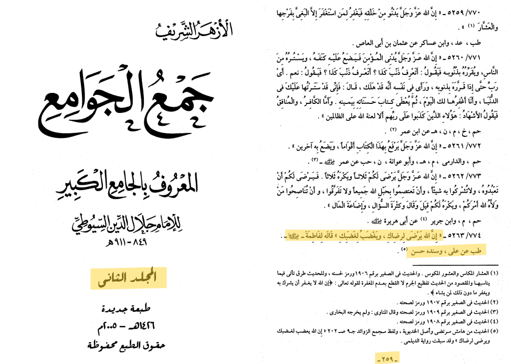 ﻭﺭﻭﻭا ﺟﻤﻴﻌﺎ ﺃﻥ اﻟﻨﺒﻲ ﷺ ﻗﺎﻝ: ﻳﺎ ﻓﺎﻃﻤﺔ ﺇﻥ اﻟﻠﻪ ﻳﻐﻀﺐ ﻟﻐﻀﺒﻚ، ﻭﻳﺮﺿﻰ ﻟﺮﺿﺎﻙ, ﻓﻬﺬا ﻛﺬﺏ ﻣﻨﻪ…ﻭﻻ ﻳﻌﺮﻑ ﻫﺬا ﻓﻲ ﺷﻲء ﻣﻦ ﻛﺘﺐ اﻟﺤﺪﻳﺚ اﻟﻤﻌﺮﻭﻓﺔ، ﻭﻻ ﻟﻪ ﺇﺳﻨﺎﺩ ﻣﻌﺮﻭﻑ ﻋﻦ اﻟﻨﺒﻲ ﷺ ﻻ ﺻﺤﻴﺢ ﻭﻻ ﺣﺴﻦ