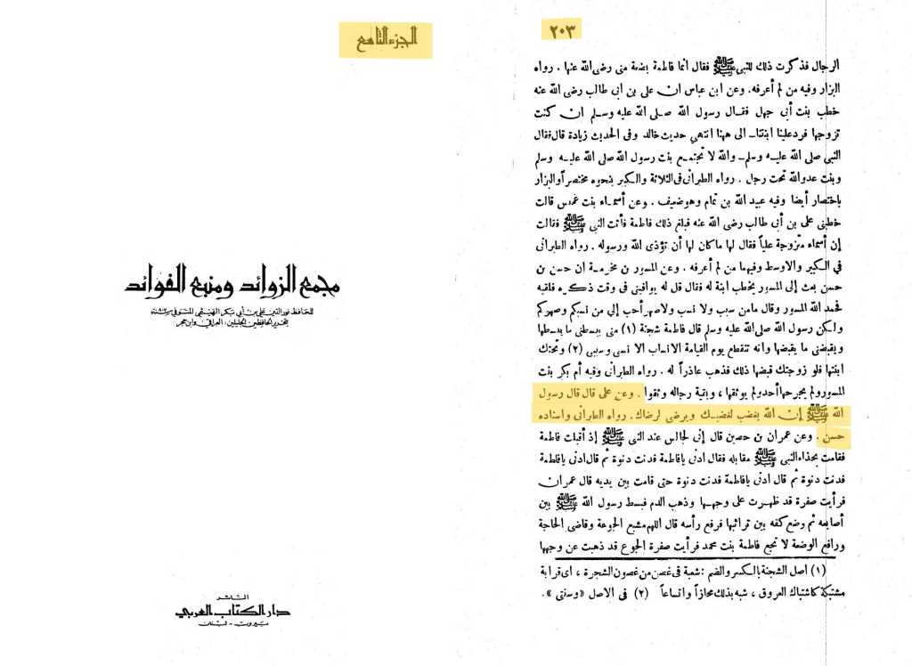 Abd-Allah ibn Muhammad al-Qazzaz said it’s narrated from Husayn ibn Zayd ibn Ali (Zayn al-Abideen) *AND* Ali ibn Umar ibn Ali (Zayn al-Abideen) on the authority of Imam Ja’far al-Sadiq who narrated from Imam Muhammad al-Baqir who narrated from Imam Zayn al-Abideen on the authority of Imam al-Husayn who narrated from Imam Ali that Sayyidna Rasulullah ﷺ said to Sayyida Fatimah al-Zahra :