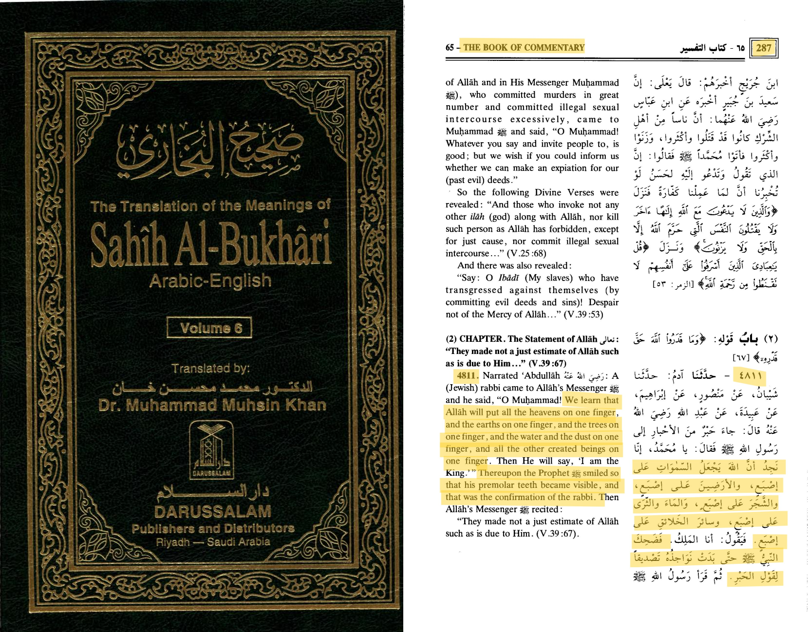 عَنْ عَبْدِ اللَّهِ قَالَ جَاءَ حَبْرٌ مِنَ الأَحْبَارِ إِلَى رَسُولِ اللَّهِ ﷺ فَقَالَ يَا مُحَمَّدُ، إِنَّا نَجِدُ أَنَّ اللَّهَ يَجْعَلُ السَّمَوَاتِ عَلَى إِصْبَعٍ وَالأَرَضِينَ عَلَى إِصْبَعٍ، وَالشَّجَرَ عَلَى إِصْبَعٍ، وَالْمَاءَ وَالثَّرَى عَلَى إِصْبَعٍ، وَسَائِرَ الْخَلاَئِقِ عَلَى إِصْبَعٍ، فَيَقُولُ أَنَا الْمَلِكُ. فَضَحِكَ النَّبِيُّ ﷺ حَتَّى بَدَتْ نَوَاجِذُهُ تَصْدِيقًا لِقَوْلِ الْحَبْرِ