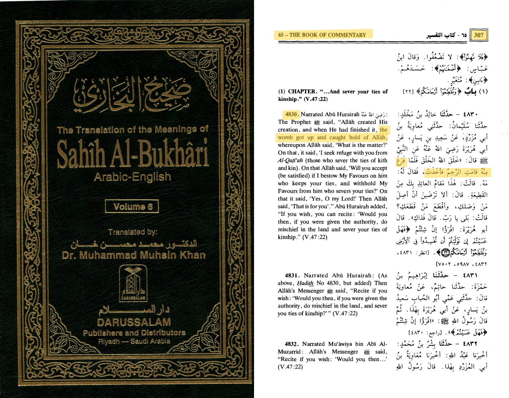 عَنْ أَبِي هُرَيْرَةَ عَنِ النَّبِيِّ ﷺ قَالَ خَلَقَ اللَّهُ الْخَلْقَ، فَلَمَّا فَرَغَ مِنْهُ قَامَتِ الرَّحِمُ فَأَخَذَتْ بِحَقْوِ الرَّحْمَنِ