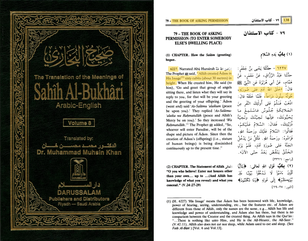 Allah created Adam in His image, sixty cubits (about 30 meters) in height.