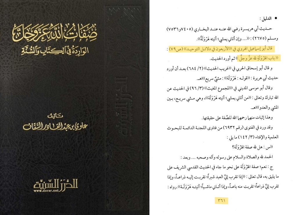 اﻟﻬﺮﻭﻟﺔ, ﺻﻔﺔ ﻓﻌﻠﻴﺔ ﺧﺒﺮﻳﺔ ﺛﺎﺑﺘﺔ ﻟﻠﻪ ﻋﺰ ﻭﺟﻞ ﺑﺎﻟﺤﺪﻳﺚ اﻟﺼﺤﻴﺢ… ﻗﺎﻝ ﺃﺑﻮ ﺇﺳﻤﺎﻋﻴﻞ اﻟﻬﺮﻭﻱ ﻓﻲ اﻷﺭﺑﻌﻮﻥ ﻓﻲ ﺩﻻﺋﻞ اﻟﺘﻮﺣﻴﺪ ﺑﺎﺏ اﻟﻬﺮﻭﻟﺔ ﻟﻠﻪ ﻋﺰ ﻭﺟﻞ