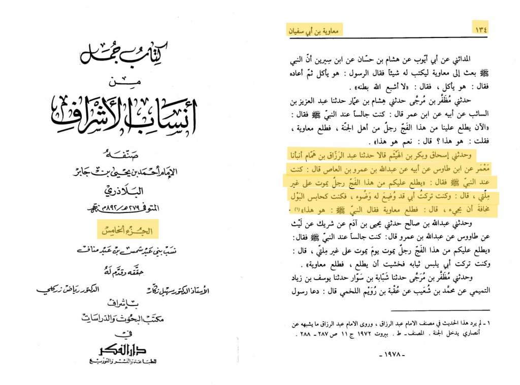 ﻭﺣﺪﺛﻨﻲ ﺇﺳﺤﺎﻕ ﻭﺑﻜﺮ ﺑﻦ اﻟﻬﻴﺜﻢ ﻗﺎﻻ ﺣﺪﺛﻨﺎ ﻋﺒﺪ اﻟﺮﺯاﻕ ﺑﻦ ﻫﻤﺎﻡ ﺃﻧﺒﺄﻧﺎ ﻣﻌﻤﺮ ﻋﻦ اﺑﻦ ﻃﺎﻭﺱ ﻋﻦ ﺃﺑﻴﻪ ﻋﻦ ﻋﺒﺪ اﻟﻠﻪ ﺑﻦ ﻋﻤﺮﻭ ﺑﻦ اﻟﻌﺎﺹ ﻗﺎﻝ: ﻛﻨﺖ ﻋﻨﺪ اﻟﻨﺒﻲ ﷺ ﻓﻘﺎﻝ: ﻳﻄﻠﻊ ﻋﻠﻴﻜﻢ ﻣﻦ ﻫﺬا اﻟﻔﺞ ﺭﺟﻞ ﻳﻤﻮﺕ ﻋﻠﻰ ﻏﻴﺮ ﻣﻠﺘﻲ.. ﻗﺎﻝ: ﻓﻄﻠﻊ ﻣﻌﺎﻭﻳﺔ ﻓﻘﺎﻝ اﻟﻨﺒﻲ ﷺ ﻫﻮ ﻫﺬا
