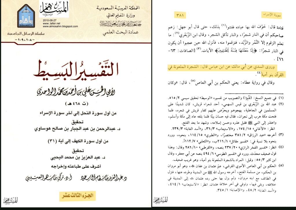 ﻭاﻟﺸﺠﺮﺓ اﻟﻤﻠﻌﻮﻧﺔ ﻓﻲ اﻟﻘﺮﺁﻥ ﻭﻧﺨﻮﻓﻬﻢ ﻓﻤﺎ ﻳﺰﻳﺪﻫﻢ ﺇﻻ ﻃﻐﻴﺎﻧﺎ ﻛﺒﻴﺮا ﻭﻻ اﺧﺘﻼﻑ ﺑﻴﻦ اﺣﺪ اﻧﻪ اﺭاﺩ ﺑﻬﺎ ﺑﻨﻰ اﻣﻴﻪ.