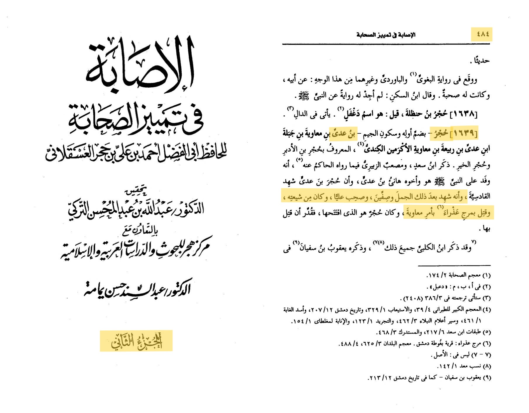 (1634) ﺣﺠﺮ اﺑﻦ ﻋﺪﻱ…ﻭﺃﻧﻪ ﺷﻬﺪ ﺑﻌﺪ ﺫﻟﻚ اﻟﺠﻤﻞ ﻭﺻﻔﻴﻦ ﻭﺻﺤﺐ ﻋﻠﻴﺎ، ﻓﻜﺎﻥ ﻣﻦ ﺷﻴﻌﺘﻪ، ﻭﻗﺘﻞ ﺑﻤﺮﺝ ﻋﺬﺭاء ﺑﺄﻣﺮ ﻣﻌﺎﻭﻳﺔ