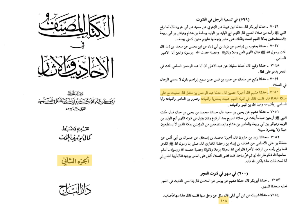 ﺣﺪﺛﻨﺎ ﻫﺸﻴﻢ، ﻗﺎﻝ: ﺃﺧﺒﺮﻧﺎ ﺣﺼﻴﻦ، ﻗﺎﻝ: ﺣﺪﺛﻨﺎ ﻋﺒﺪ اﻟﺮﺣﻤﻦ ﺑﻦ ﻣﻌﻘﻞ، ﻗﺎﻝ: ﺻﻠﻴﺖ ﻣﻊ ﻋﻠﻲ ﺻﻼﺓ اﻟﻐﺪاﺓ، ﻗﺎﻝ: ﻓﻘﻨﺖ، ﻓﻘﺎﻝ ﻓﻲ ﻗﻨﻮﺗﻪ: اﻟﻠﻬﻢ ﻋﻠﻴﻚ ﺑﻤﻌﺎﻭﻳﺔ ﻭﺃﺷﻴﺎﻋﻪ،