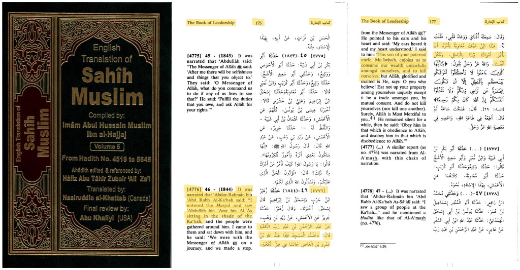 Abd-Allah Ibn Amr Ibn al-Aas was sitting in the shade of the Ka’ba. I said to him: This cousin of yours, Mu’awiyyah, orders us to unjustly consume our wealth among ourselves and to kill one another.