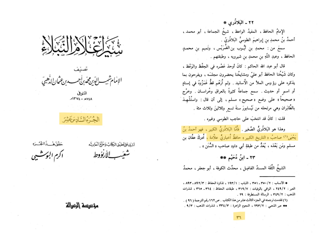 ﻓﺄﻣﺎ اﻟﺒﻼﺫﺭﻱ اﻟﻜﺒﻴﺮ ﻓﻬﻮ ﺃﺣﻤﺪ ﺑﻦ ﻳﺤﻴﻰ, ﺻﺎﺣﺐ “التاريخ اﻟﻜﺒﻴﺮ”, ﺣﺎﻓﻆ ﺃﺧﺒﺎﺭﻱ ﻋﻼﻣﺔ