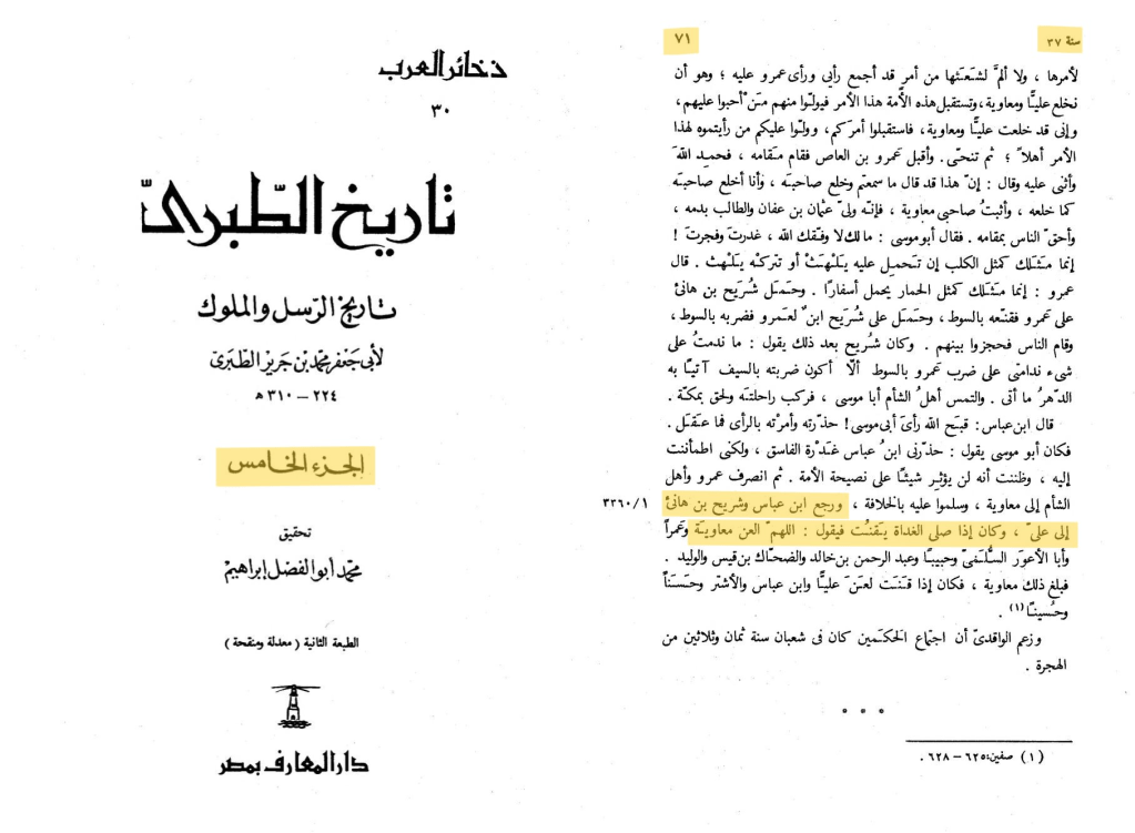 ﻭﺭﺟﻊ اﺑﻦ ﻋﺒﺎﺱ ﻭﺷﺮﻳﺢ ﺑﻦ ﻫﺎﻧﺊ ﺇﻟﻰ ﻋﻠﻲ، ﻭﻛﺎﻥ ﺇﺫا ﺻﻠﻰ اﻟﻐﺪاﺓ ﻳﻘﻨﺖ ﻓﻴﻘﻮﻝ: اﻟﻠﻬﻢ اﻟﻌﻦ ﻣﻌﺎﻭﻳﺔ
