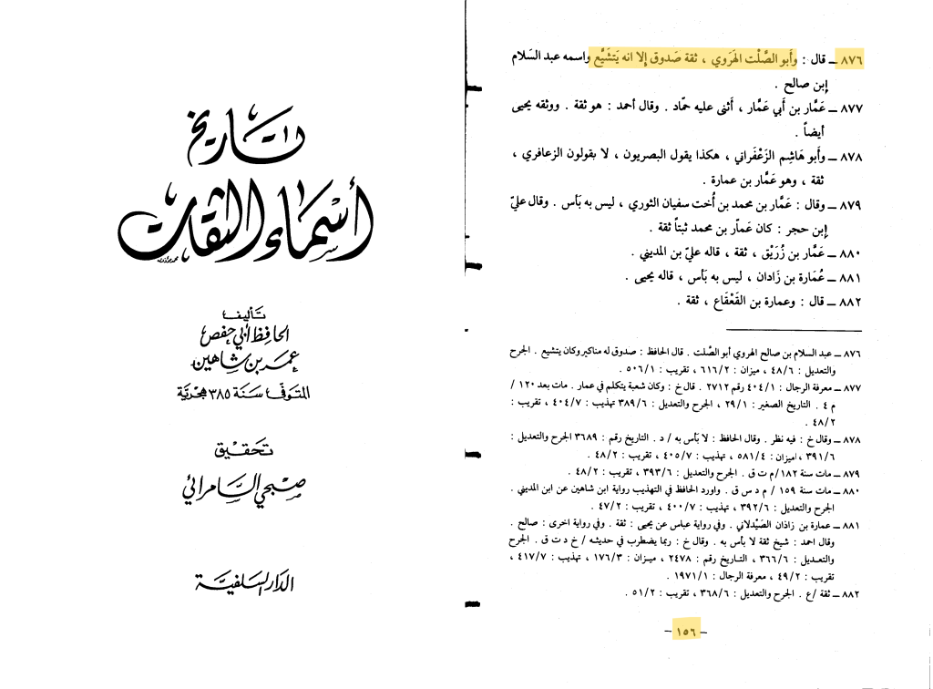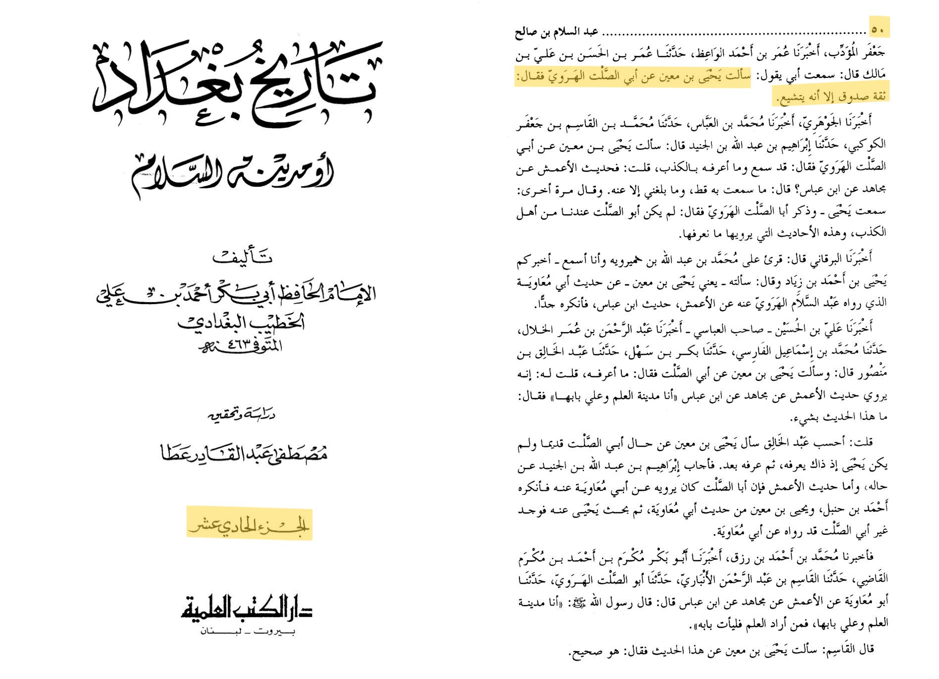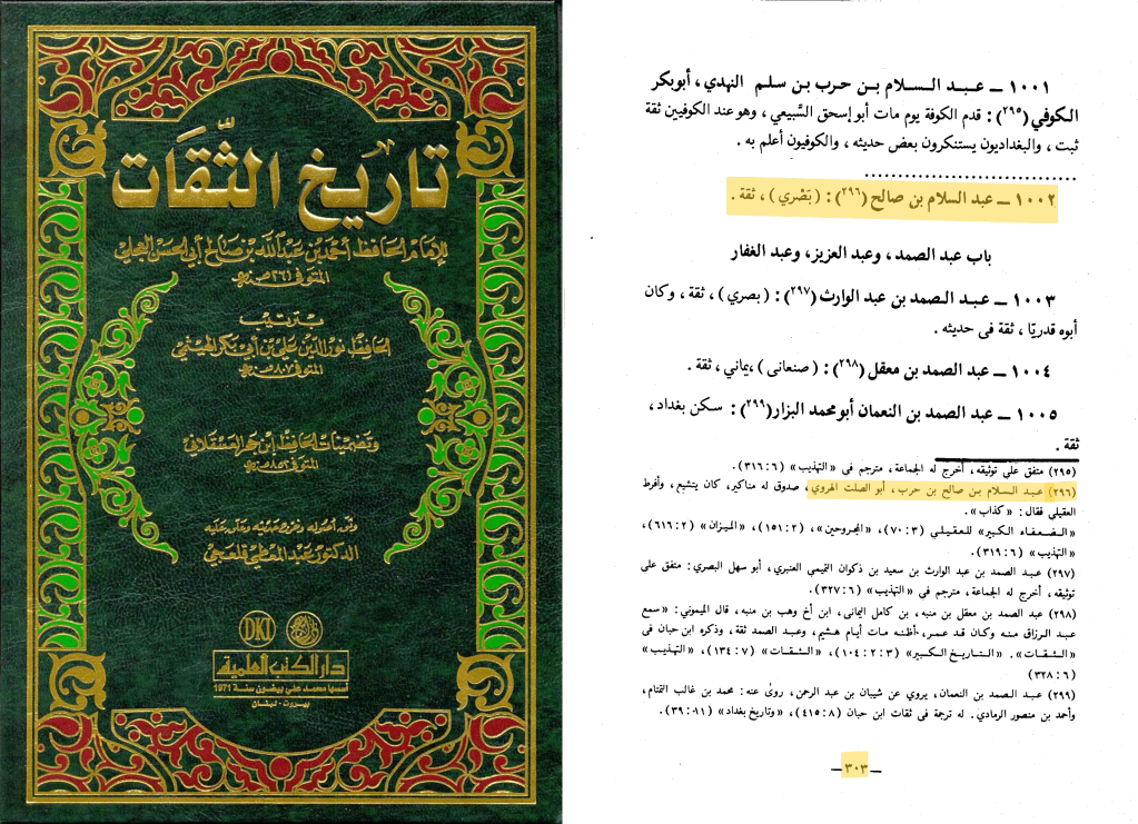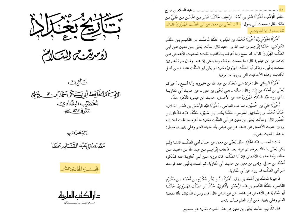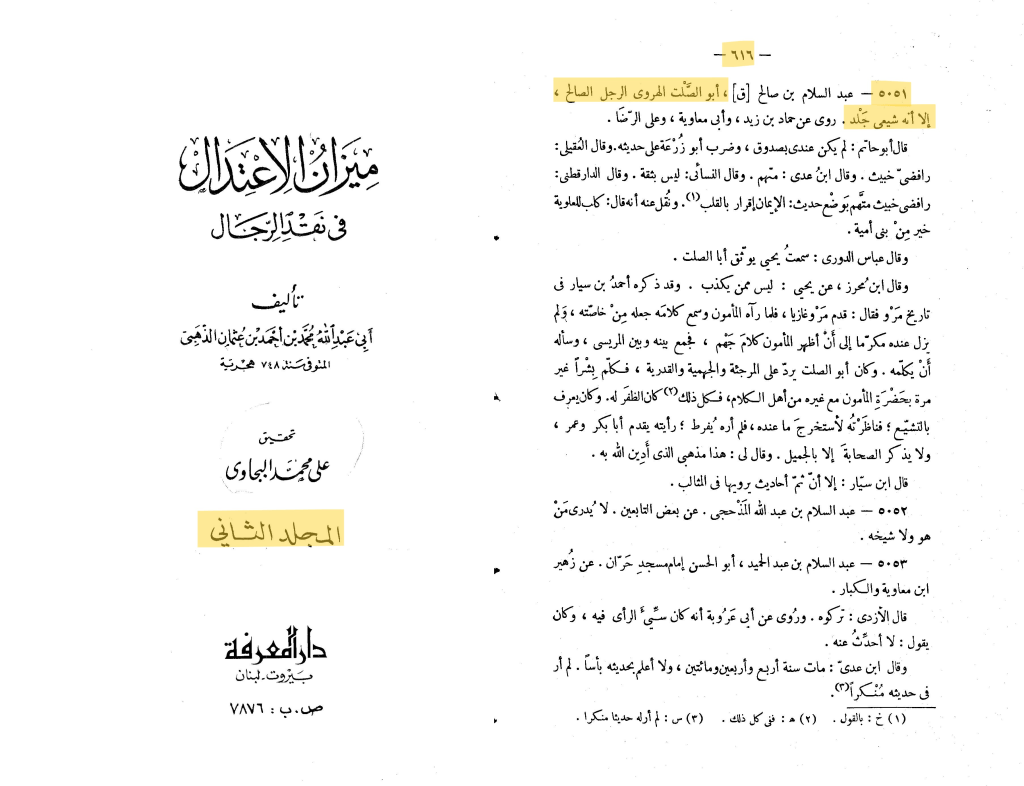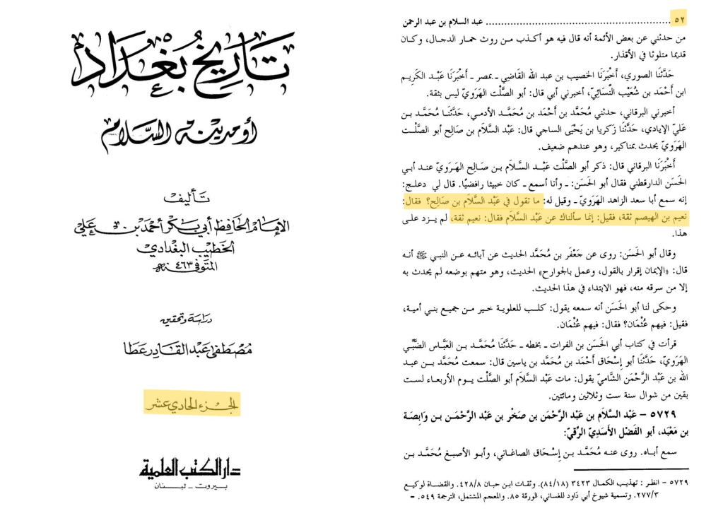 Reported by al-Burqani that Da’laj told me that he heard Abu Sa’ad al-Harrawi and he was asked : What do you say about Abd al-Salam ibn Salih (Abu al-Salt)? He replied Na’eem ibn al-Haysam said ‘He is trustworthy.’