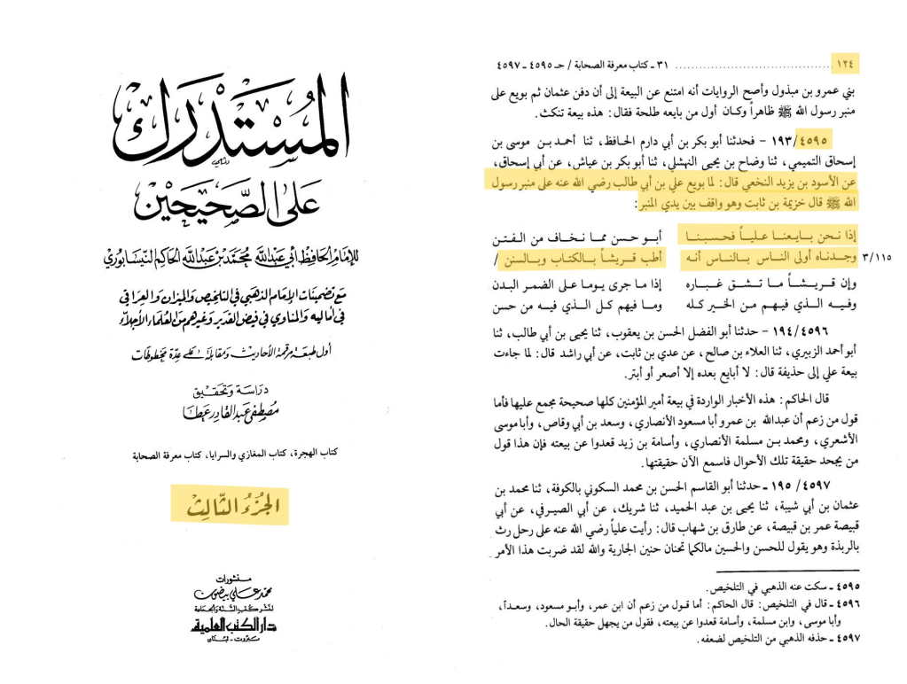 ﻋﻦ اﻷﺳﻮﺩ ﺑﻦ ﻳﺰﻳﺪ ﻗﺎﻝ: ﻟﻤﺎ ﺑﻮﻳﻊ ﻋﻠﻲ ﺑﻦ ﺃﺑﻲ ﻃﺎﻟﺐ ﻗﺎﻝ ﺧﺰﻳﻤﺔ ﺑﻦ ﺛﺎﺑﺖ ﻭﻫﻮ ﻭاﻗﻒ ﺑﻴﻦ ﻳﺪﻱ اﻟﻤﻨﺒﺮ: ﺇﺫا ﻧﺤﻦ ﺑﺎﻳﻌﻨﺎ ﻋﻠﻴﺎ ﻓﺤﺴﺒﻨﺎ … ﻭﺟﺪﻧﺎﻩ ﺃﻭﻟﻰ اﻟﻨﺎﺱ ﺑﺎﻟﻨﺎﺱ ﺃﻧﻪ … ﺃﻃﺐ ﻗﺮﻳﺶا ﺑﺎﻟﻜﺘﺎﺏ ﻭﺑﺎﻟﺴﻨﻦ