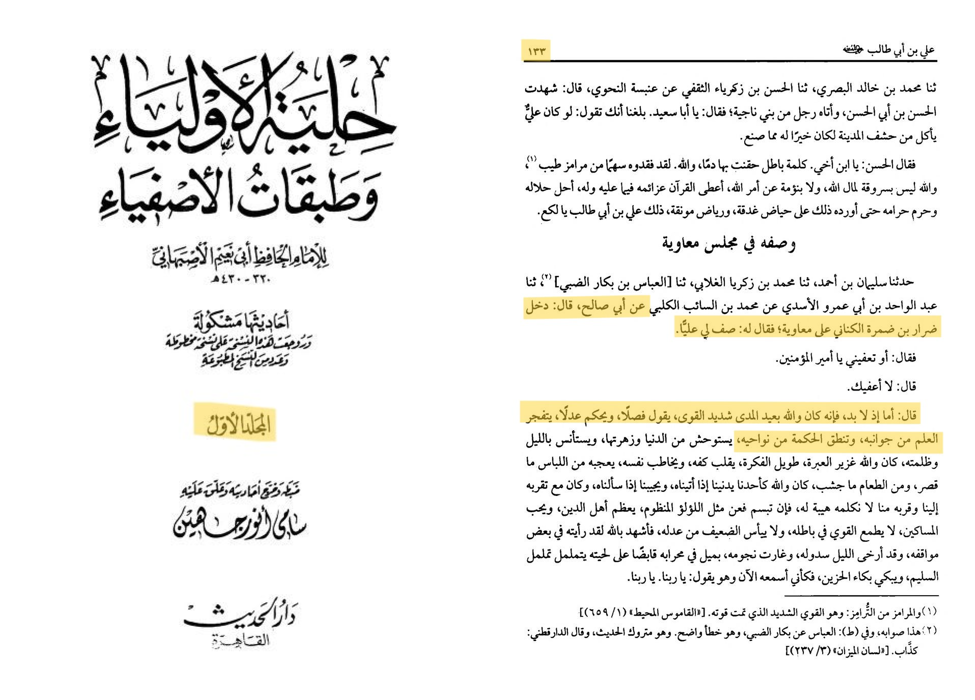 ﻋﻦ ﺃﺑﻲ ﺻﺎﻟﺢ، ﻗﺎﻝ: ﺩﺧﻞ ﺿﺮاﺭ ﺑﻦ ﺿﻤﺮﺓ اﻟﻜﻨﺎﻧﻲ ﻋﻠﻰ ﻣﻌﺎﻭﻳﺔ، ﻓﻘﺎﻝ ﻟﻪ: ﺻﻒ ﻟﻲ ﻋﻠﻴﺎ، ﻓﻘﺎﻝ… ﺃﻣﺎ ﺇﺫ ﻻ ﺑﺪ، ﻓﺈﻧﻪ ﻛﺎﻥ ﻭاﻟﻠﻪ ﺑﻌﻴﺪ اﻟﻤﺪﻯ، ﺷﺪﻳﺪ اﻟﻘﻮﻯ، ﻳﻘﻮﻝ ﻓﺼﻼ ﻭﻳﺤﻜﻢ ﻋﺪﻻ، ﻳﺘﻔﺠﺮ اﻟﻌﻠﻢ ﻣﻦ ﺟﻮاﻧﺒﻪ، ﻭﺗﻨﻄﻖ اﻟﺤﻜﻤﺔ ﻣﻦ ﻧﻮاﺣﻴﻪ