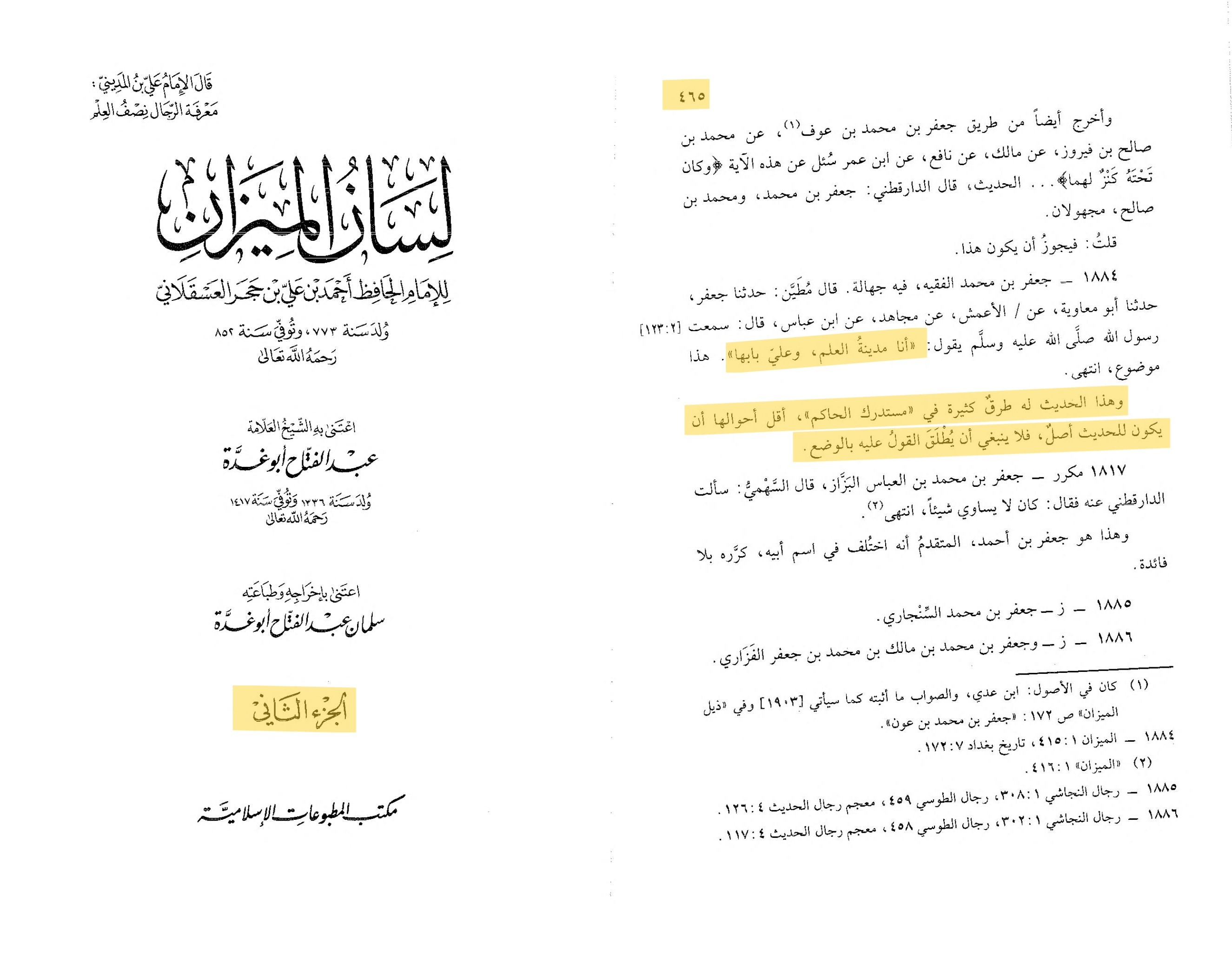 حَدَّثَنَا أَبُو الْعَبَّاسِ مُحَمَّدُ بْنُ يَعْقُوبَ، ثنا مُحَمَّدُ بْنُ عَبْدِ الرَّحِيمِ الْهَرَوِيُّ، بِالرَّمْلَةِ، ثنا أَبُو الصَّلْتِ عَبْدُ السَّلَامِ بْنُ صَالِحٍ، ثنا أَبُو مُعَاوِيَةَ، عَنِ الْأَعْمَشِ، عَنْ مُجَاهِدٍ، عَنِ ابْنِ عَبَّاسٍ رضي الله عنهما قَالَ: قَالَ رَسُولُ اللَّهِ صلى الله عليه وسلم: «أَنَا مَدِينَةُ الْعِلْمِ وَعَلِيٌّ بَابُهَا، فَمَنْ أَرَادَ الْمَدِينَةَ فَلْيَأْتِ الْبَابَ»