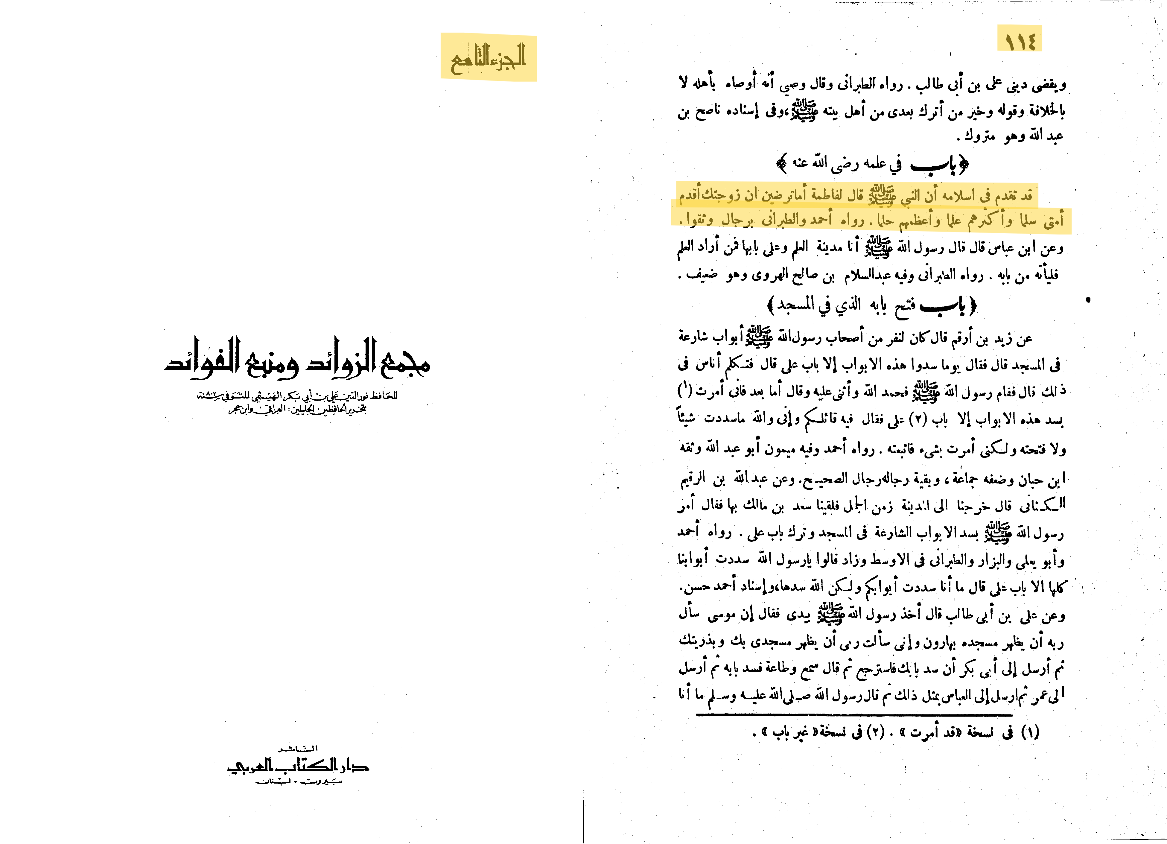 ﺃﻥ اﻟﻨﺒﻲ ﺻﻠﻰ اﻟﻠﻪ ﻋﻠﻴﻪ ﻭﺳﻠﻢ ﻗﺎﻝ ﻟﻔﺎﻃﻤﺔ: ﺃﻣﺎ ﺗﺮﺿﻴﻦ ﺃﻥ ﺯﻭﺟﺘﻚ ﺃﻗﺪﻡ ﺃﻣﺘﻲ ﺳﻠﻤﺎ، ﻭﺃﻛﺜﺮﻫﻢ ﻋﻠﻤﺎ، ﻭﺃﻋﻈﻤﻬﻢ ﺣﻠﻤﺎ»؟