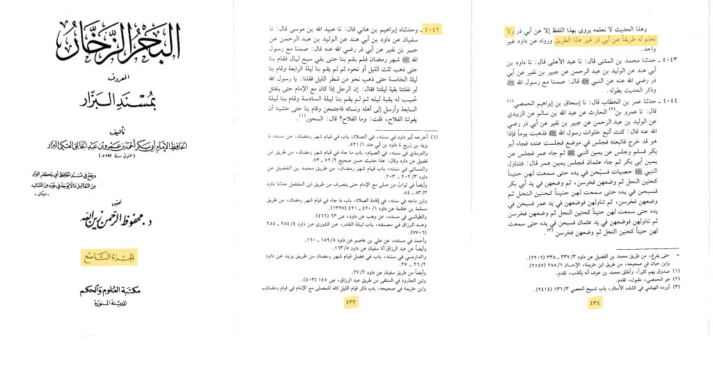 حَدَّثَنَا مُحَمَّدُ بْنُ الْفُضَيْلِ، عَنْ دَاوُدَ بْنِ أَبِي هِنْدٍ، عَنِ الْوَلِيدِ بْنِ عَبْدِ الرَّحْمَنِ الْجُرَشِيِّ، عَنْ جُبَيْرِ بْنِ نُفَيْرٍ، عَنْ أَبِي ذَرٍّ، قَالَ….فَقَالَ إِنَّهُ مَنْ قَامَ مَعَ الإِمَامِ حَتَّى يَنْصَرِفَ كُتِبَ لَهُ قِيَامُ لَيْلَةٍ