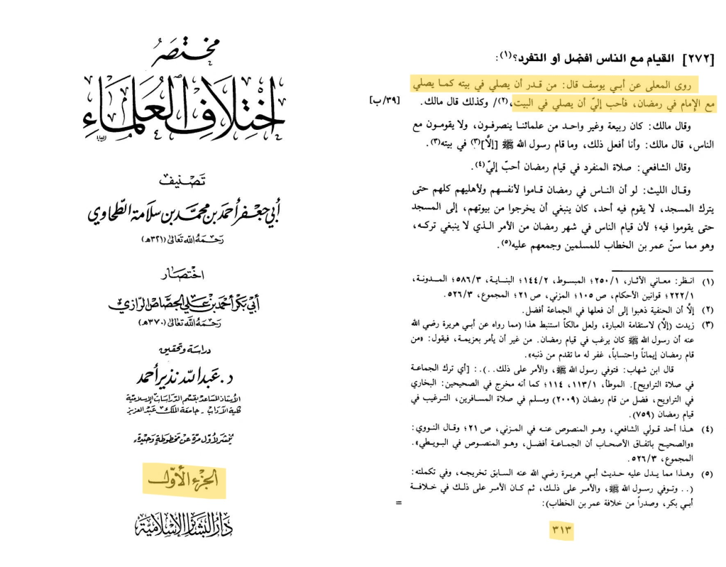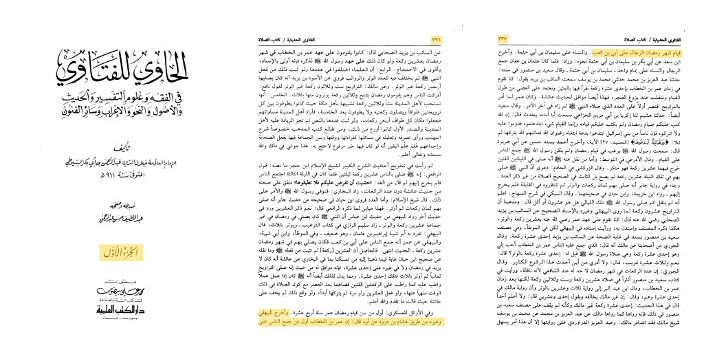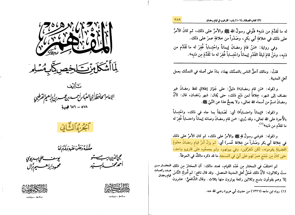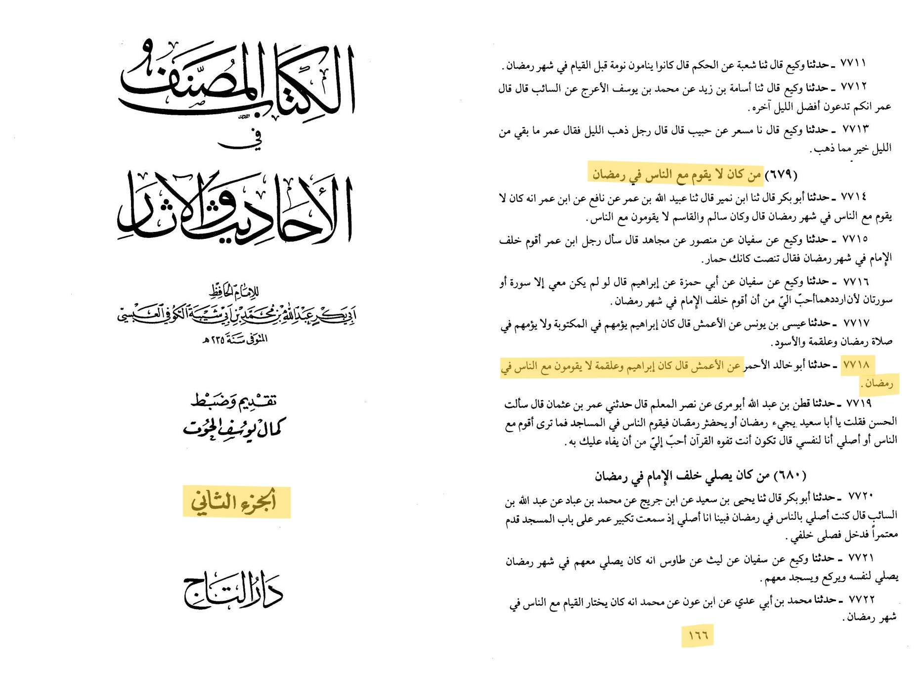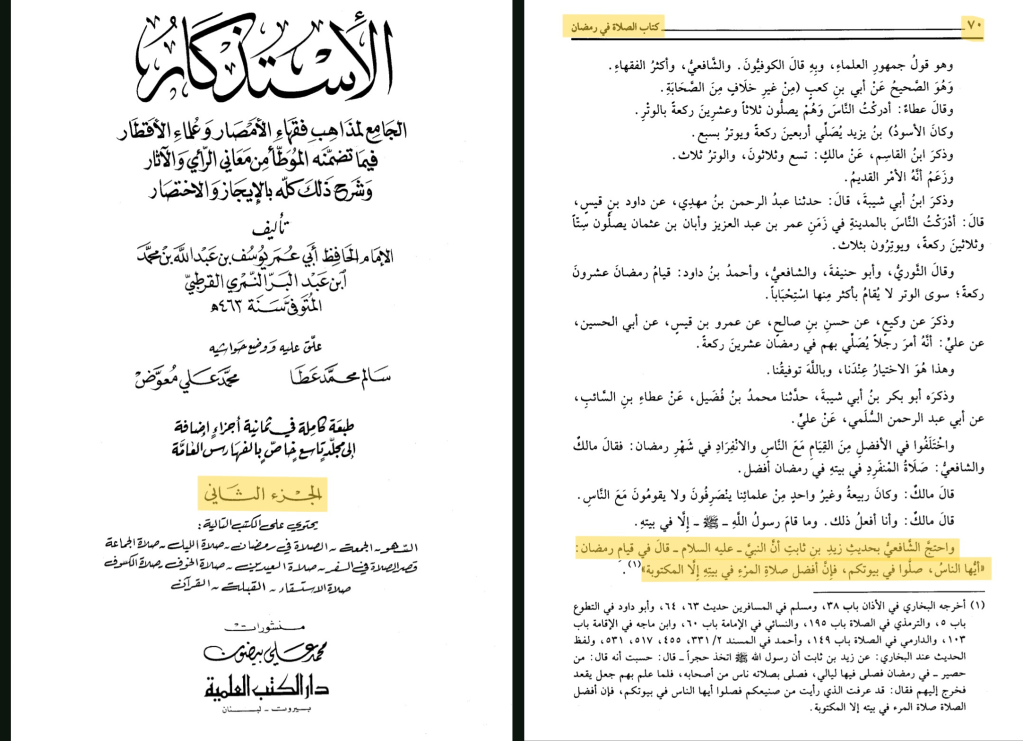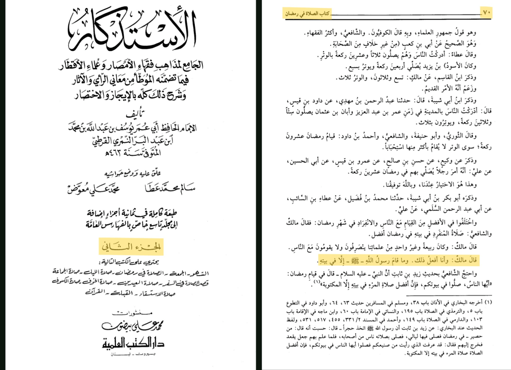 ﻭﺃﻣﺎ اﻟﺘﺮاﻭﻳﺢ ﻓﻲ ﺭﻣﻀﺎﻥ ﻓﺈﻧﻪ ﺳﻨﺔ اﻟﺼﺤﺎﺑﺔ….ﻓﺄﻣﺎ اﻟﻔﻌﻞ اﻟﺬﻱ ﻭاﻇﺐ ﻋﻠﻴﻪ اﻟﺼﺤﺎﺑﺔ ﻓﻠﻴﺲ ﺑﺴﻨﺔ ﻭﻫﻮ ﻋﻠﻰ ﺃﺻﻠﻬﻢ ﻣﺴﺘﻘﻴﻢ ﻓﺈﻧﻬﻢ ﻻ ﻳﺮﻭﻥ ﺃﻗﻮاﻟﻬﻢ ﺣﺠﺔ ﻓﻼ ﻳﺮﻭﻥ ﺃﻓﻌﺎﻟﻬﻢ ﺳﻨﺔ ﺃﻳﻀﺎ. ﻭﻋﻨﺪﻧﺎ ﺃﻗﻮاﻟﻬﻢ ﺣﺠﺔ ﻓﺘﻜﻮﻥ ﺃﻓﻌﺎﻟﻬﻢ ﺳﻨﺔ