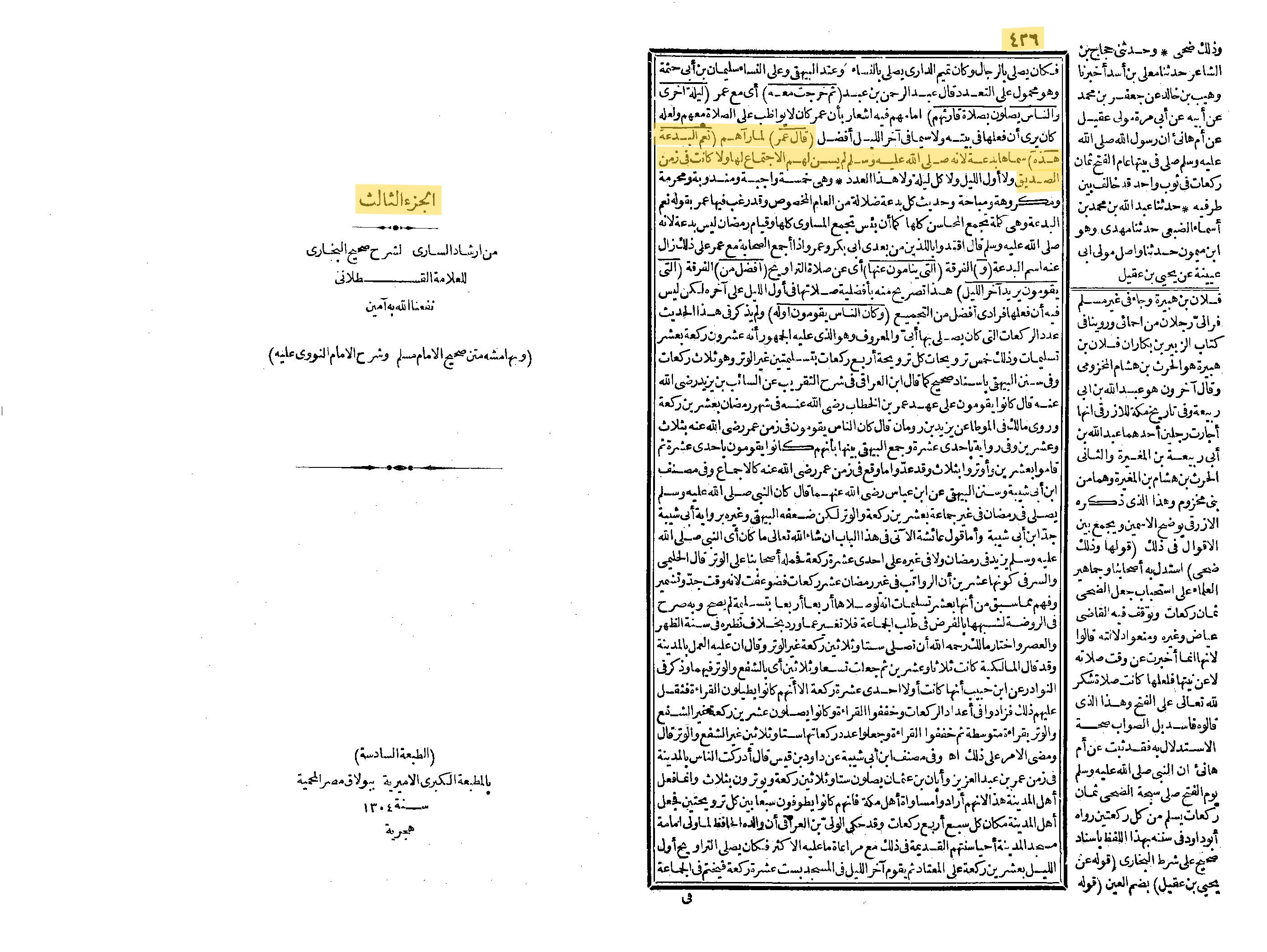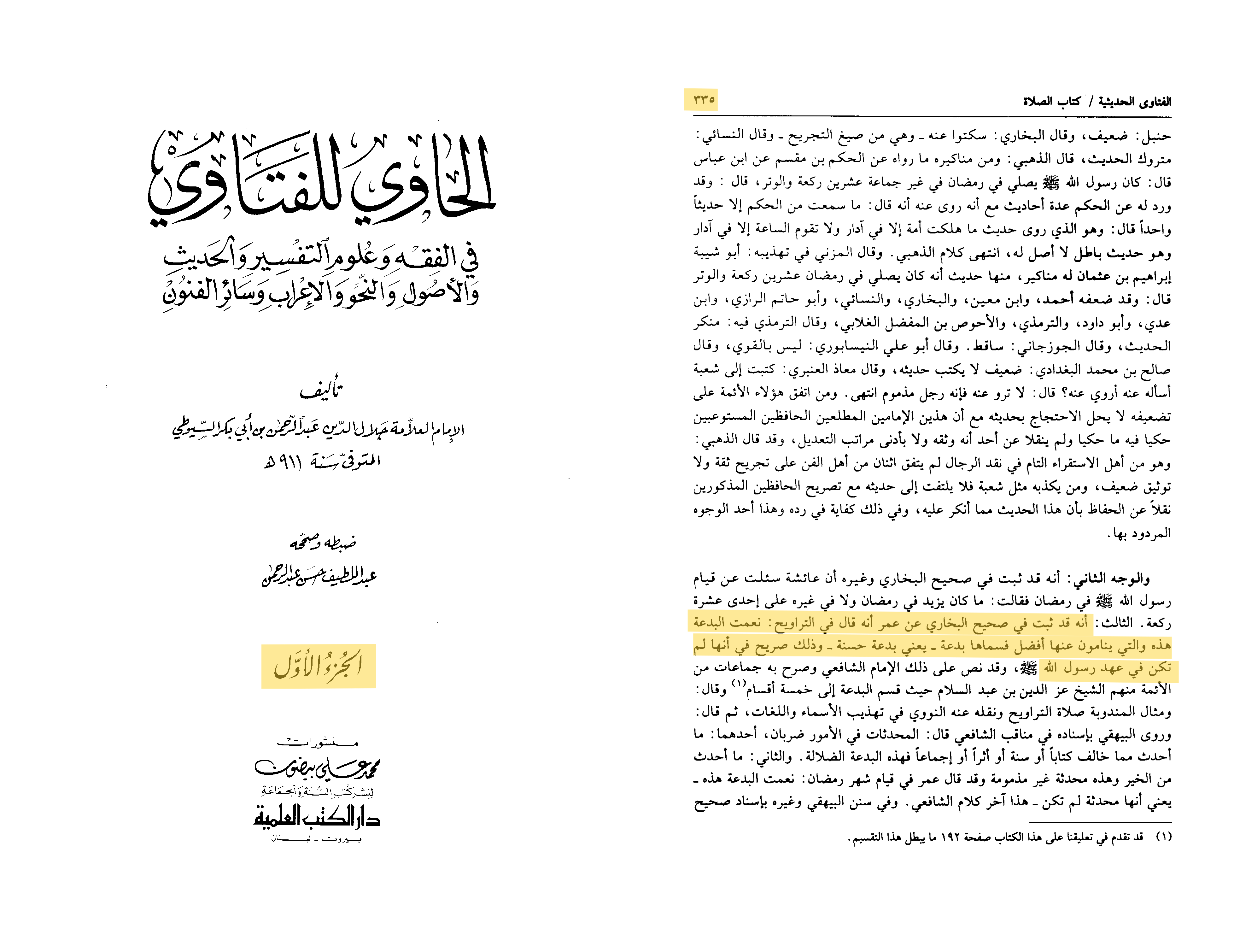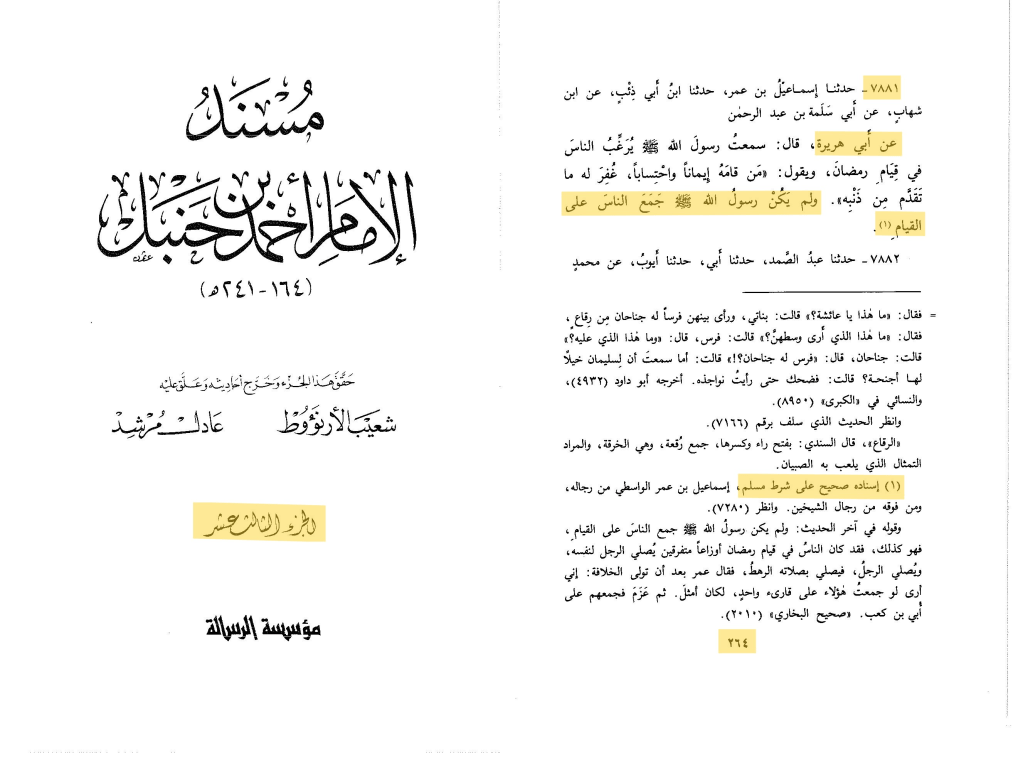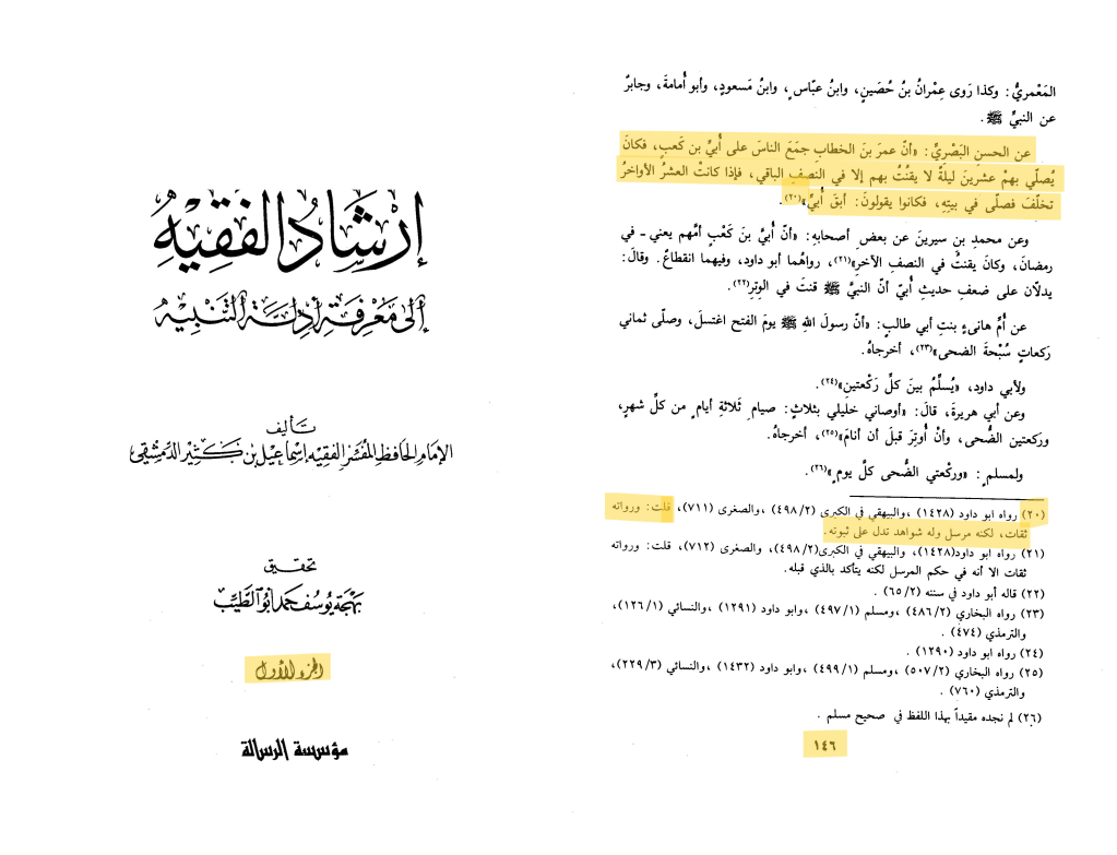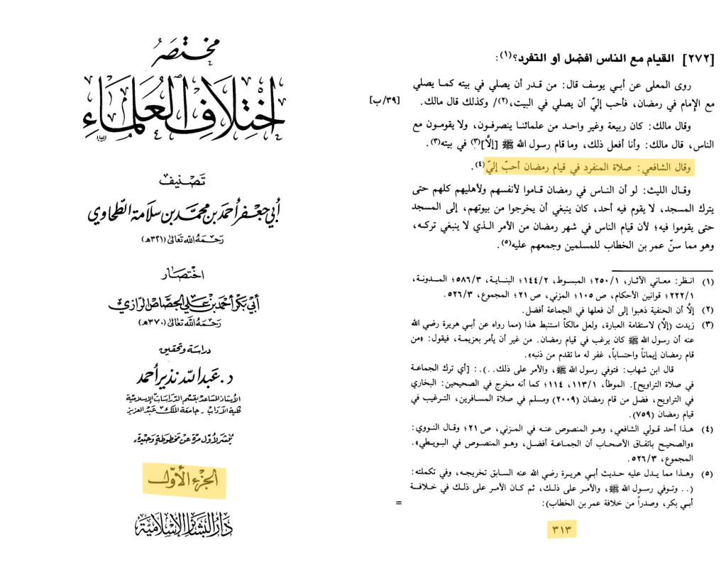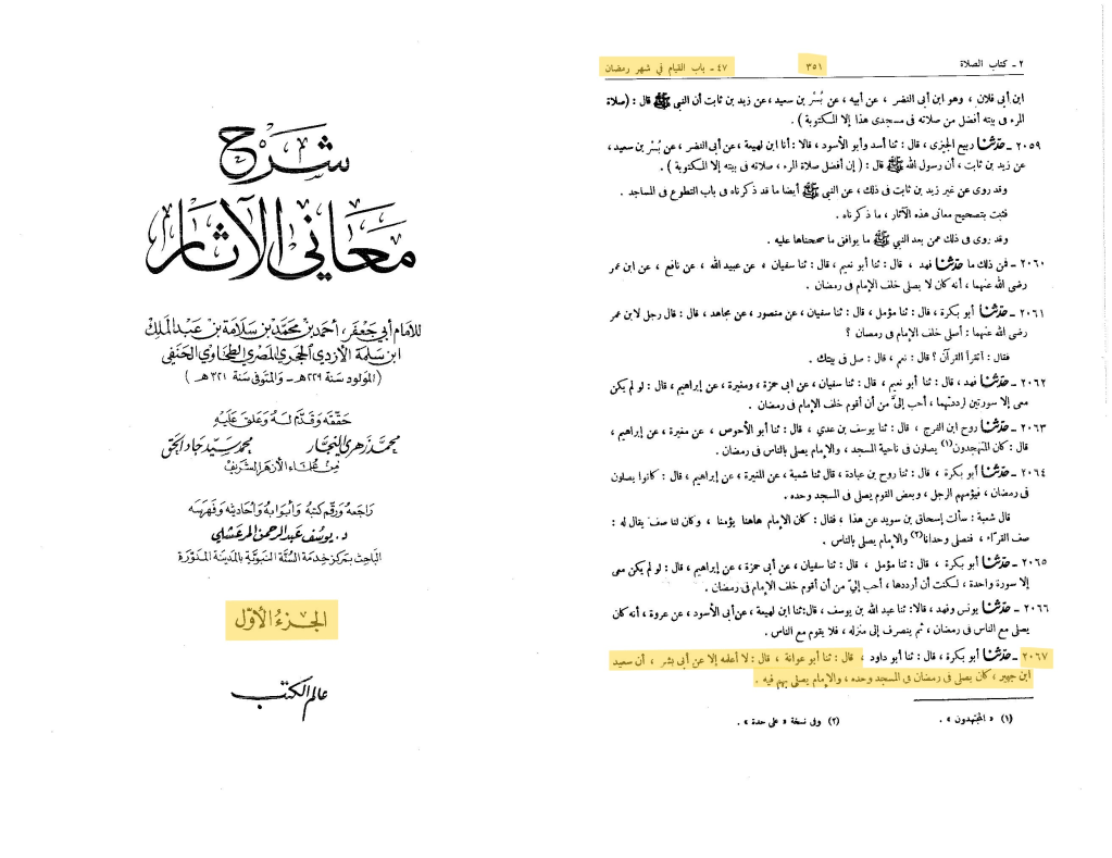 ﻭﺃﻣﺎ اﻟﺘﺮاﻭﻳﺢ ﻓﻲ ﺭﻣﻀﺎﻥ ﻓﺈﻧﻪ ﺳﻨﺔ اﻟﺼﺤﺎﺑﺔ….ﻓﺄﻣﺎ اﻟﻔﻌﻞ اﻟﺬﻱ ﻭاﻇﺐ ﻋﻠﻴﻪ اﻟﺼﺤﺎﺑﺔ ﻓﻠﻴﺲ ﺑﺴﻨﺔ ﻭﻫﻮ ﻋﻠﻰ ﺃﺻﻠﻬﻢ ﻣﺴﺘﻘﻴﻢ ﻓﺈﻧﻬﻢ ﻻ ﻳﺮﻭﻥ ﺃﻗﻮاﻟﻬﻢ ﺣﺠﺔ ﻓﻼ ﻳﺮﻭﻥ ﺃﻓﻌﺎﻟﻬﻢ ﺳﻨﺔ ﺃﻳﻀﺎ. ﻭﻋﻨﺪﻧﺎ ﺃﻗﻮاﻟﻬﻢ ﺣﺠﺔ ﻓﺘﻜﻮﻥ ﺃﻓﻌﺎﻟﻬﻢ ﺳﻨﺔ
