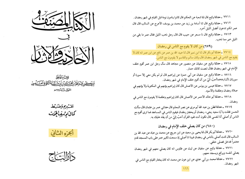 ، ﻋﻦ ﻧﺎﻓﻊ، ﻋﻦ اﺑﻦ ﻋﻤﺮ: ﺃﻧﻪ ﻛﺎﻥ ﻻ ﻳﻘﻮﻡ ﻣﻊ اﻟﻨﺎﺱ ﻓﻲ ﺷﻬﺮ ﺭﻣﻀﺎﻥ» ﻗﺎﻝ: ﻭﻛﺎﻥ ﺳﺎﻟﻢ، ﻭاﻟﻘﺎﺳﻢ ﻻ ﻳﻘﻮﻣﻮﻥ ﻣﻊ اﻟﻨﺎﺱ