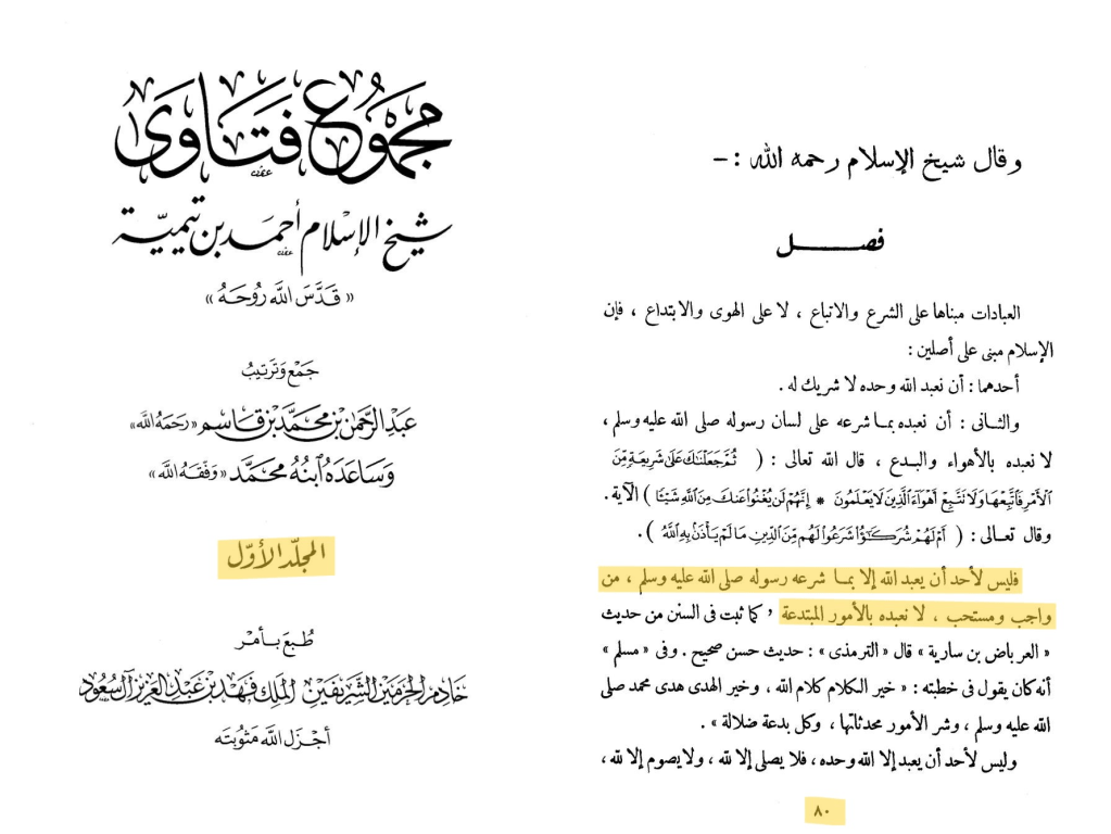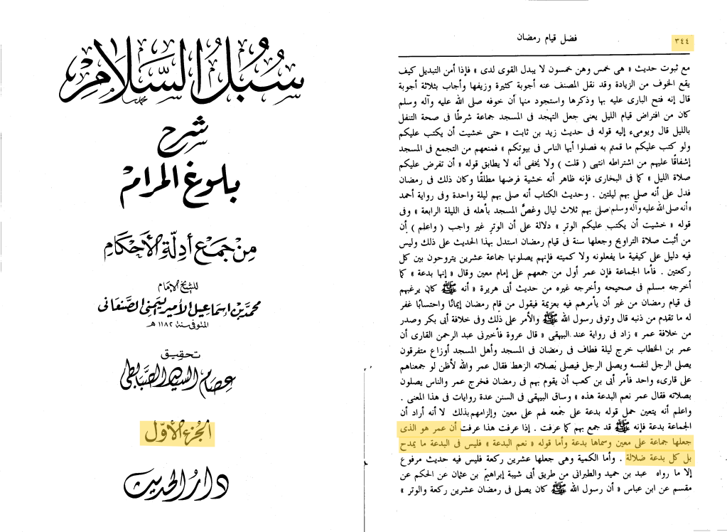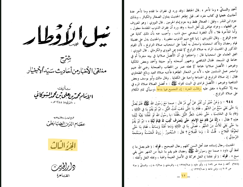 ﺃﻥ ﻋﻤﺮ ﻫﻮ اﻟﺬﻱ ﺟﻌﻠﻬﺎ ﺟﻤﺎﻋﺔ ﻋﻠﻰ ﻣﻌﻴﻦ ﻭﺳﻤﺎﻫﺎ ﺑﺪﻋﺔ ﻭﺃﻣﺎ ﻗﻮﻟﻪ ” ﻧﻌﻢ اﻟﺒﺪﻋﺔ ” ﻓﻠﻴﺲ ﻓﻲ اﻟﺒﺪﻋﺔ ﻣﺎ ﻳﻤﺪﺡ ﺑﻞ ﻛﻞ ﺑﺪﻋﺔ ﺿﻼﻟﺔ