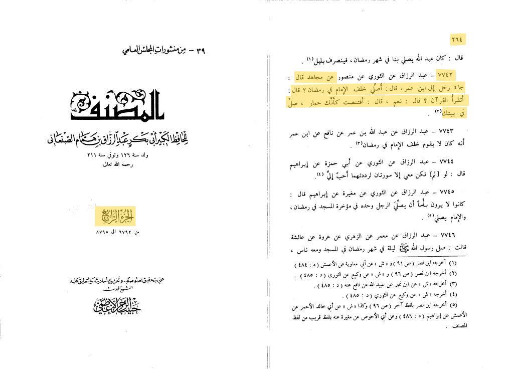 ﻋﻦ اﻟﺜﻮﺭﻱ، ﻋﻦ ﻣﻨﺼﻮﺭ، ﻋﻦ ﻣﺠﺎﻫﺪ ﻗﺎﻝ: ﺟﺎء ﺭﺟﻞ ﺇﻟﻰ اﺑﻦ ﻋﻤﺮ ﻗﺎﻝ: ﺃﺻﻠﻲ ﺧﻠﻒ اﻹﻣﺎﻡ ﻓﻲ ﺭﻣﻀﺎﻥ؟ ﻗﺎﻝ: «ﺃﺗﻘﺮﺃ اﻟﻘﺮﺁﻥ؟ ﻗﺎﻝ: ﻧﻌﻢ ﻗﺎﻝ: ﺃﻓﺘﻨﺼﺖ ﻛﺄﻧﻚ ﺣﻤﺎﺭ؟ ﺻﻞ ﻓﻲ ﺑﻴﺘﻚ