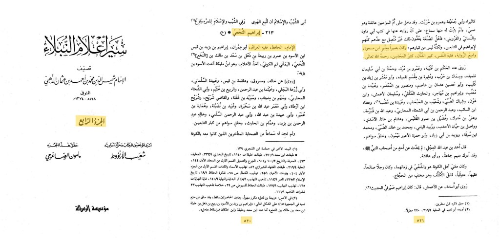 إبراهيم النخعي…الإمام ، الحافظ ، فقيه العراق …وكان بصيرا بعلم ابن مسعود ، واسع الرواية ، فقيه النفس ، كبير الشأن ، كثير المحاسن ، رحمه الله تعالى .