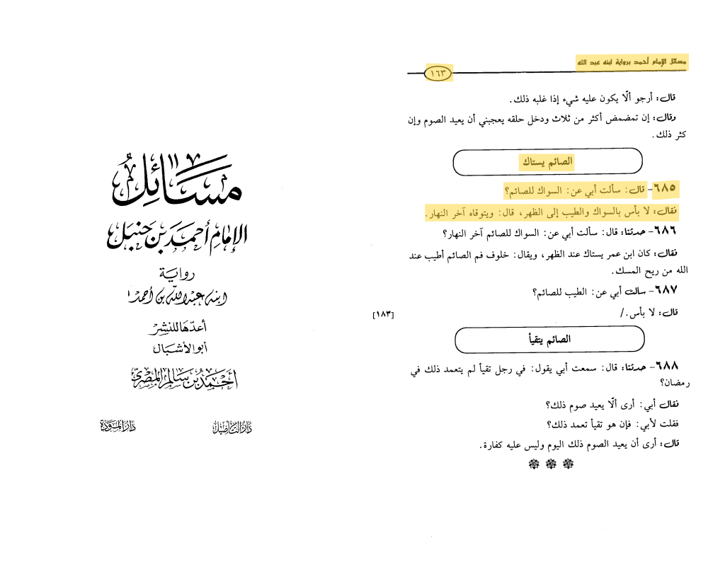 ﻭﻗﺎﻝ ﺃﺣﻤﺪ ﺑﻦ ﻣﻨﻴﻊ ﺣﺪﺛﻨﺎ اﻟﻬﻴﺜﻢ ﺑﻦ ﺧﺎﺭﺟﺔ ﺛﻨﺎ ﻳﺤﻴﻰ ﺑﻦ ﺣﻤﺰﺓ ﻋﻦ اﻟﻨﻌﻤﺎﻥ ﺑﻦ اﻟﻤﻨﺬﺭ ﻋﻦ ﻋﻄﺎء ﻭﻃﺎﻭﻭﺱ ﻭﻣﺠﺎﻫﺪ ﻋﻦ اﺑﻦ ﻋﺒﺎﺱ ﺃﻥ اﻟﻨﺒﻲ ﷺ ﺗﺴﻮﻙ ﻭﻫﻮ ﺻﺎﺋﻢ