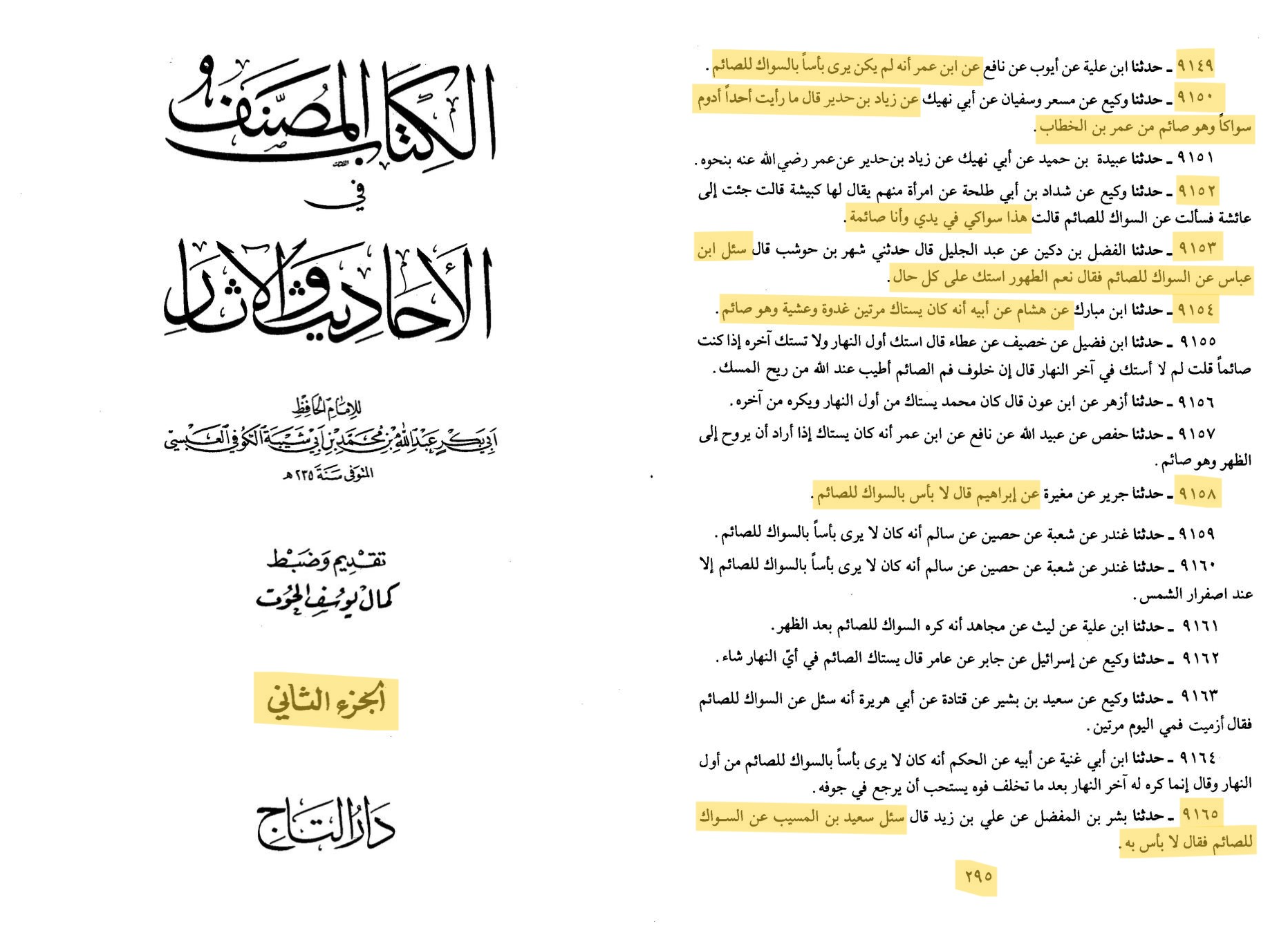 ﻋﻦ ﺃﻳﻮﺏ، ﻋﻦ ﻧﺎﻓﻊ، ﻋﻦ اﺑﻦ ﻋﻤﺮ، «ﺃﻧﻪ ﻟﻢ ﻳﻜﻦ ﻳﺮﻯ ﺑﺄﺳﺎ ﺑﺎﻟﺴﻮاﻙ ﻟﻠﺼﺎﺋﻢ