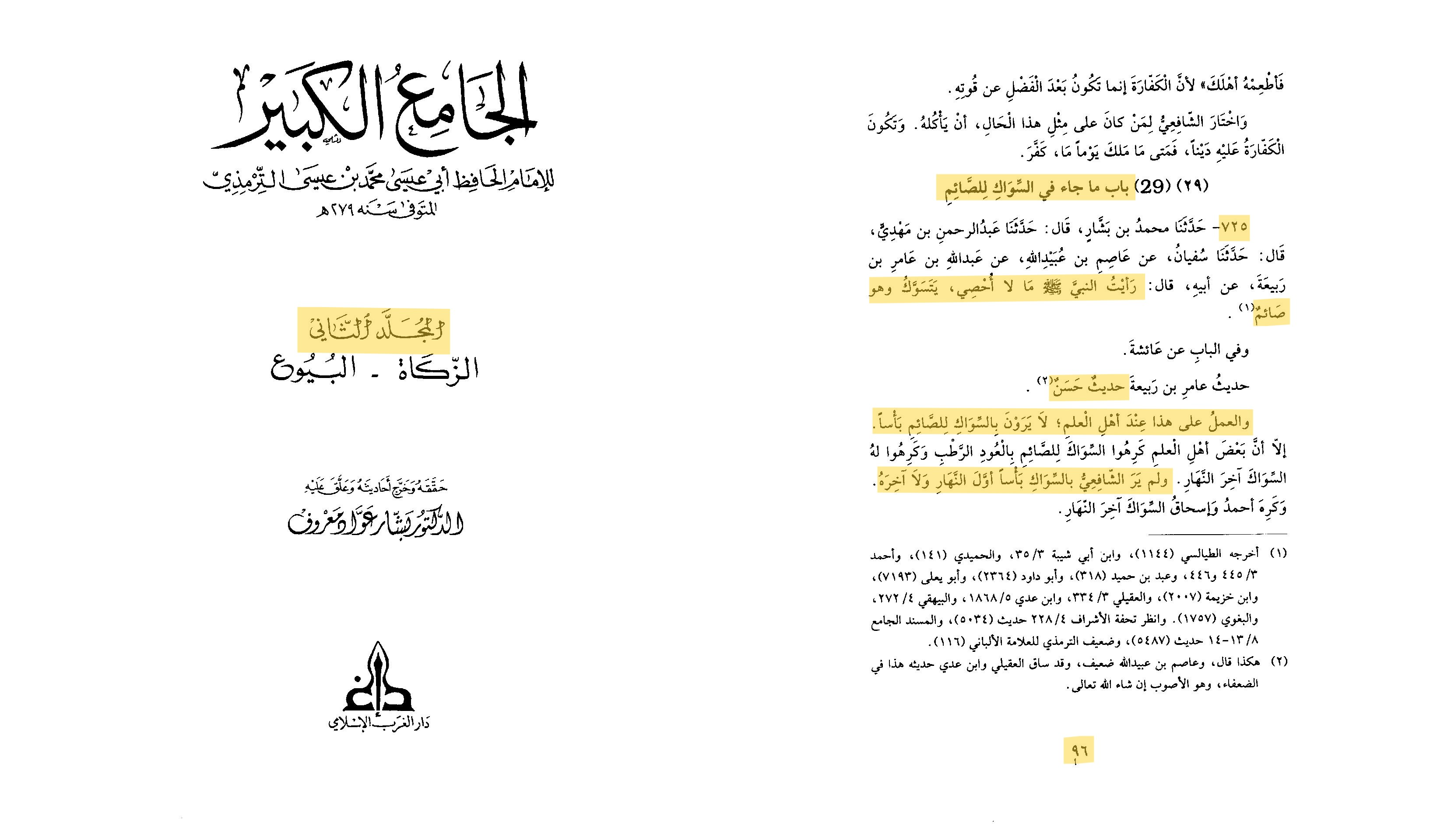 عَنْ عَبْدِ اللَّهِ بْنِ عَامِرِ بْنِ رَبِيعَةَ، عَنْ أَبِيهِ، قَالَ رَأَيْتُ النَّبِيَّ صلى الله عليه وسلم مَا لاَ أُحْصِي يَتَسَوَّكُ وَهُوَ صَائِمٌ..قَالَ أَبُو عِيسَى حَدِيثُ عَامِرِ بْنِ رَبِيعَةَ حَدِيثٌ حَسَنٌ . وَالْعَمَلُ عَلَى هَذَا عِنْدَ أَهْلِ الْعِلْمِ لاَ يَرَوْنَ بِالسِّوَاكِ لِلصَّائِمِ بَأْسًا إِلاَّ أَنَّ بَعْضَ أَهْلِ الْعِلْمِ كَرِهُوا السِّوَاكَ لِلصَّائِمِ بِالْعُودِ الرَّطْبِ وَكَرِهُوا لَهُ السِّوَاكَ آخِرَ النَّهَارِ وَلَمْ يَرَ الشَّافِعِيُّ بِالسِّوَاكِ بَأْسًا أَوَّلَ النَّهَارِ وَلاَ آخِرَهُ