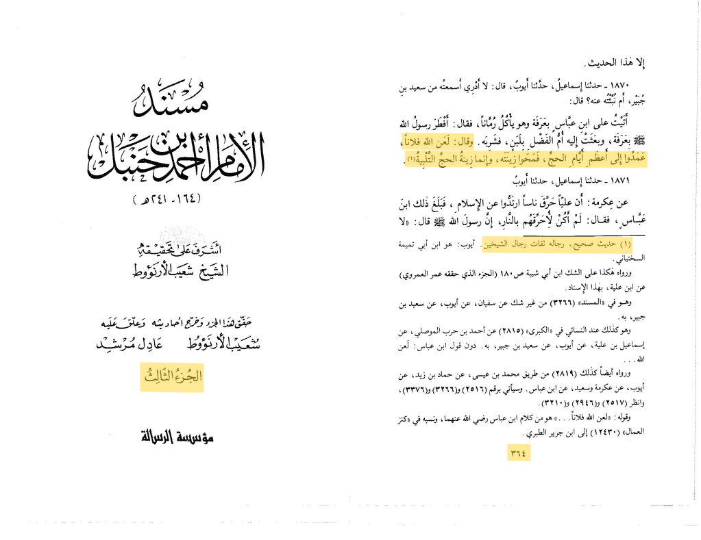 عَنْ سَعِيدِ بْنِ جُبَيْرٍ، قَالَ: كُنَّا عِنْدَ ابْنِ عَبَّاسٍ بِعَرَفَةَ، فَقَالَ: يَا سَعِيدُ مَا لِي لَا أَسْمَعُ النَّاسَ يُلَبُّونَ؟ ” فَقُلْتُ: يَخَافُونَ مُعَاوِيَةَ فَخَرَجَ ابْنُ عَبَّاسٍ مِنْ فُسْطَاطِهِ، فَقَالَ: ” لَبَّيْكَ اللهُمَّ لَبَّيْكَ وَإِنْ رَغِمَ أَنْفُ مُعَاوِيَةَ اللهُمَّ الْعَنْهُمْ فَقَدْ تَرَكُوا السُّنَّةَ مِنْ بُغْضِ عَلِيٍّ