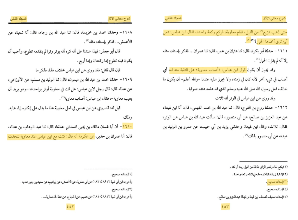 أن أبا غسان مالك بن يحيى الهمداني حدثنا قال: ثنا عبد الوهاب بن عطاء، قال: أنا عمران بن حدير، عن عكرمة أنه قال: كنت مع ابن عباس عند معاوية نتحدث حتى ذهب هزيع من الليل، فقام معاوية، فركع ركعة واحدة، فقال ابن عباس: “من أين ترى أخذها الحمار