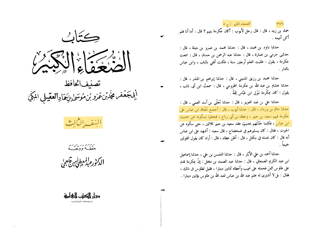 ﺣﺪﺛﻨﺎ ﺣﺎﺗﻢ ﺑﻦ ﻭﺭﺩاﻥ ﻗﺎﻝ: ﺣﺪﺛﻨﺎ ﺃﻳﻮﺏ ﻗﺎﻝ: اﺟﺘﻤﻊ ﺣﻔﺎﻅ اﺑﻦ ﻋﺒﺎﺱ ﻋﻠﻰ ﻋﻜﺮﻣﺔ ﻓﻴﻬﻢ: ﺳﻌﻴﺪ ﺑﻦ ﺟﺒﻴﺮ ﻭﻋﻄﺎء ﺑﻦ ﺃﺑﻲ ﺭﺑﺎﺡ، ﻓﺠﻌﻠﻮا ﻳﺴﺄﻟﻮﻧﻪ ﻋﻦ ﺣﺪﻳﺚ اﺑﻦ ﻋﺒﺎﺱ،