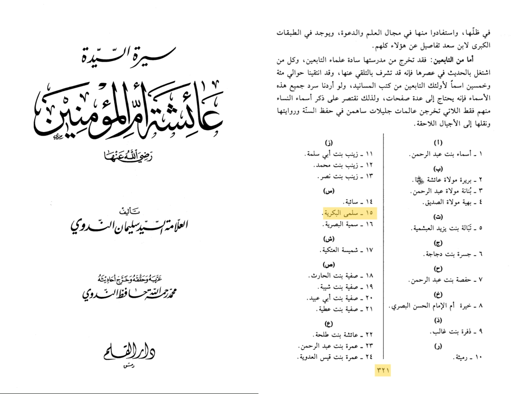 ولذلك نقتصر على ذكر أسماء النساء منهم فقط اللاتي تخرجن عالمات جليلات ساهمن في حفظ السنة وروايتها ونقلها إلى الأجيال اللاحقة….15 – سلمى البكرية.