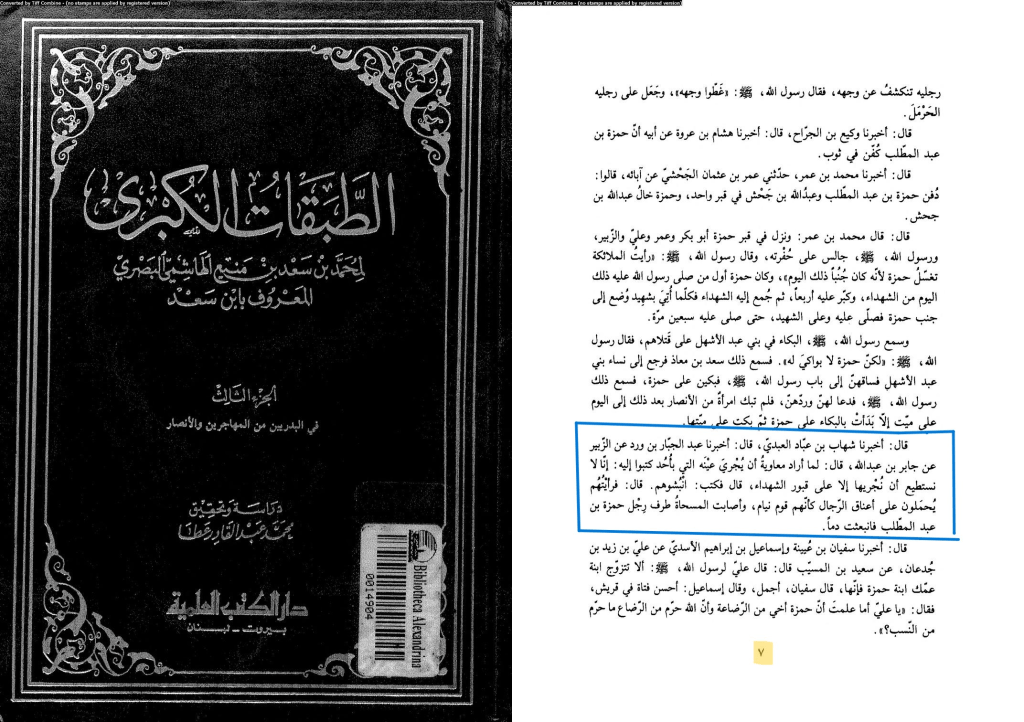 ﻗﺎﻝ: ﺃﺧﺒﺮﻧﺎ ﺷﻬﺎﺏ ﺑﻦ ﻋﺒﺎﺩ اﻝﻋﺒﺪﻳ. ﻗﺎﻝ: ﺃﺧﺒﺮﻧﺎ ﻋﺒﺪ اﻟﺠﺒﺎﺭ ﺑﻦ ﻭﺭﺩ ﻋﻦ اﻟﺰﺑﻴﺮ ﻋﻦ ﺟﺎﺑﺮ ﺑﻦ ﻋﺒﺪ اﻟﻠﻪ. ﻗﺎﻝ: ﻟﻤﺎ ﺃﺭاﺩ ﻣﻌﺎﻭﻳﺔ ﺃﻥ ﻳﺠﺮﻱ ﻋﻴﻨﻪ اﻟﺘﻲ ﺑﺄﺣﺪ ﻛﺘﺒﻮا ﺇﻟﻴﻪ: ﺇﻧﺎ ﻻ ﻧﺴﺘﻄﻴﻊ ﺃﻥ ﻧﺠﺮﻳﻬﺎ ﺇﻻ ﻋﻠﻰ ﻗﺒﻮﺭ اﻟﺸﻬﺪاء. ﻗﺎﻝ ﻓﻜﺘﺐ: اﻧﺒﺸﻮﻫﻢ. ﻗﺎﻝ: ﻓﺮﺃﻳﺘﻬﻢ ﻳﺤﻤﻠﻮﻥ ﻋﻠﻰ ﺃﻋﻨﺎﻕ اﻟﺮﺟﺎﻝ ﻛﺄﻧﻬﻢ ﻗﻮﻡ ﻧﻴﺎﻡ. ﻭﺃﺻﺎﺑﺖ اﻟﻤﺴﺤﺎﺓ ﻃﺮﻑ ﺭﺟﻞ ﺣﻤﺰﺓ ﺑﻦ ﻋﺒﺪ اﻟﻤﻄﻠﺐ ﻓﺎﻧﺒﻌﺜﺖ ﺩﻣﺎ