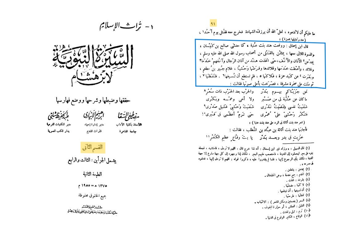 قَالَ ابْنُ إسْحَاقَ: وَوَقَعَتْ هِنْدُ بِنْتُ عُتْبَةَ، كَمَا حَدَّثَنِي صَالِحُ بْنُ كَيْسَانَ، وَالنِّسْوَةُ اللَّاتِي مَعَهَا، يُمَثِّلْنَ بِالْقَتْلَى مِنْ أَصْحَابِ رَسُول الله صلى الله عليه وسلم، يجدّ عَن الْآذَانَ وَالْأُنُفَ، حَتَّى اتَّخَذَتْ هِنْدُ مِنْ آذَانِ الرِّجَالِ وَآنُفِهِمْ خَدَمًا وَقَلَائِدَ، وَأَعْطَتْ خَدَمَهَا وَقَلَائِدَهَا وَقِرَطَتَهَا وَحْشِيًّا، غُلَامَ جُبَيْرِ بْنِ مُطْعِمٍ، وَبَقَرَتْ عَنْ كَبِدِ حَمْزَةَ، فَلَاكَتْهَا ، فَلَمْ تَسْتَطِعْ أَنْ تُسِيغَهَا ، فَلَفَظَتْهَا