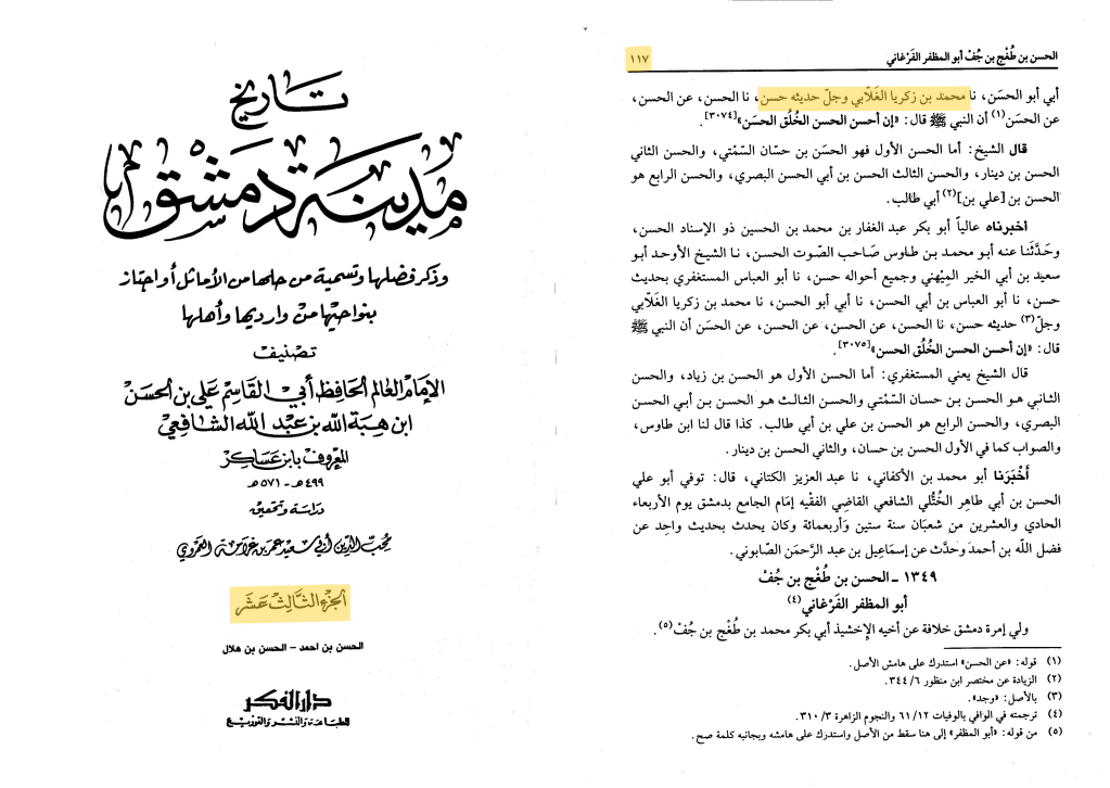 • This narration has been criticized because of Muhammad Ibn Zakariyyah al-Ghalabi but there is no Jarh’ Mufassar on him. Ibn Asakir himself called his Hadiths of Hasan status :