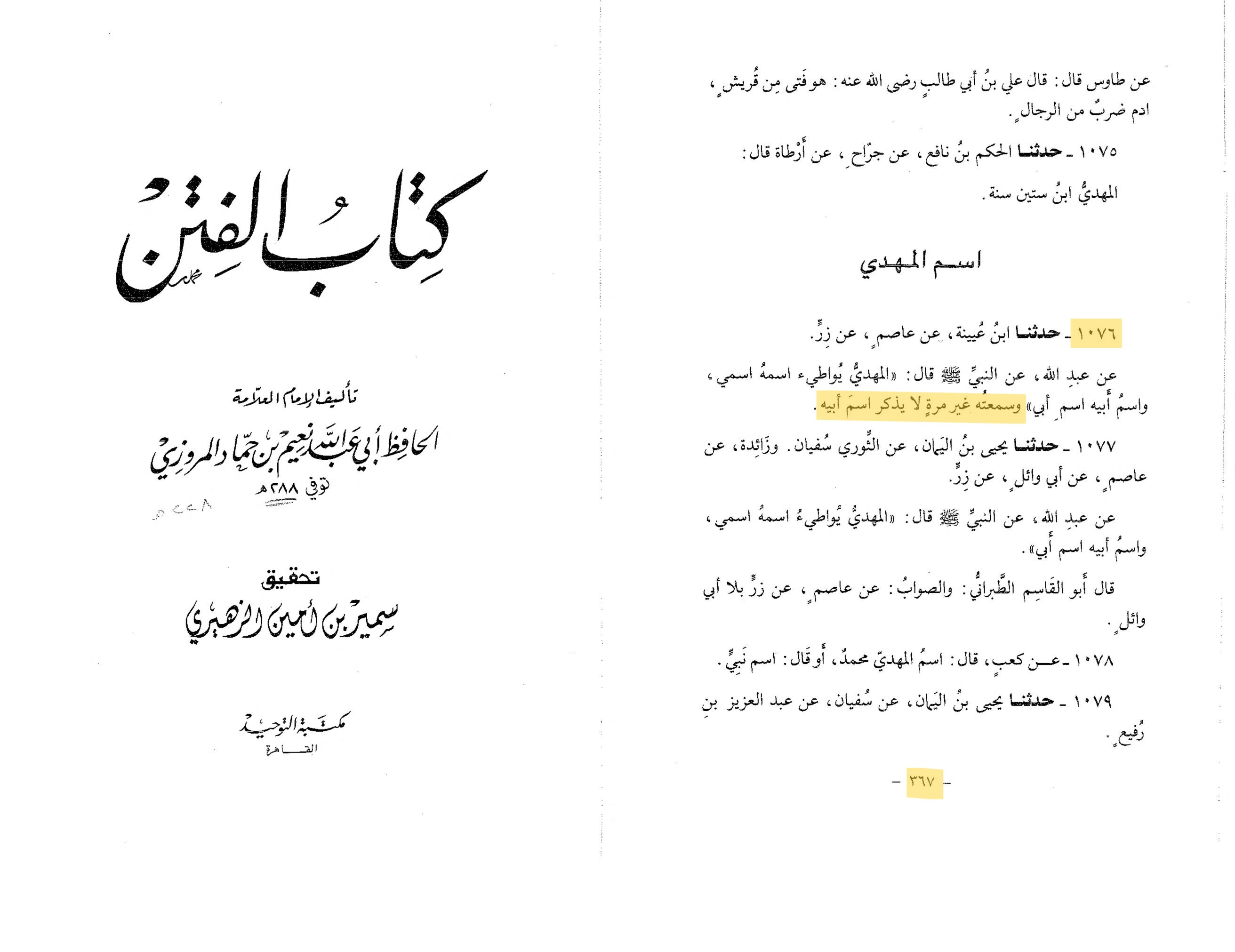 عَنْ سَعِيدِ بْنِ جُبَيْرٍ، عَنِ ابْنِ عَبَّاسٍ، قَالَ: مِنِّا الْمَنْصُورُ وَمِنَّا السَّفَّاحُ وَمِنَّا الْمَهْدِيُّ. وَقَدْ رُوِّينَا هَذَا الْحَدِيثَ مِنْ حَدِيثِ الضَّحَّاكِ، عَنِ ابْنِ عَبَّاسٍ، عَنِ النَّبِيِّ صلى الله عليه وسلم مَرْفُوعًا. وَالْمَوْقُوفُ أَصَحُّ…عَنْ عَبْدِ اللَّهِ، عَنِ النَّبِيِّ صلى الله عليه وسلم قَالَ : الْمَهْدِيُّ يُوَاطِئُ اسْمُهُ اسْمِي، وَاسْمُ أَبِيهِ اسْمَ أَبِي