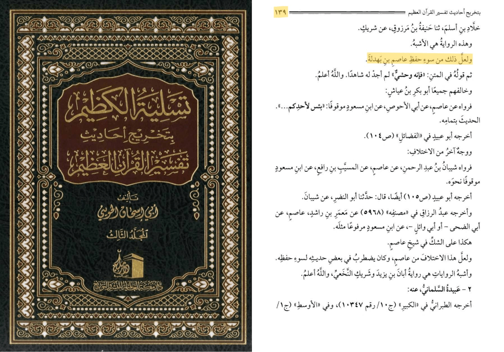 ولعل هذا الاختلاف من عاصم، وكان يضطرب في بعض حديثه، لسوء حفظه