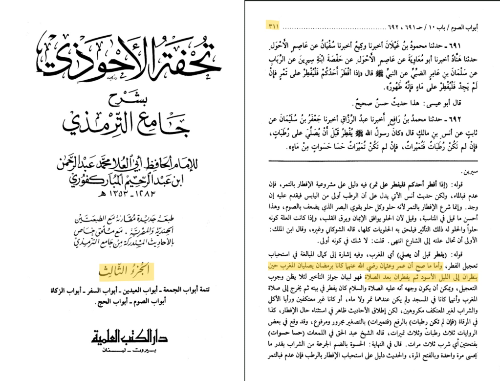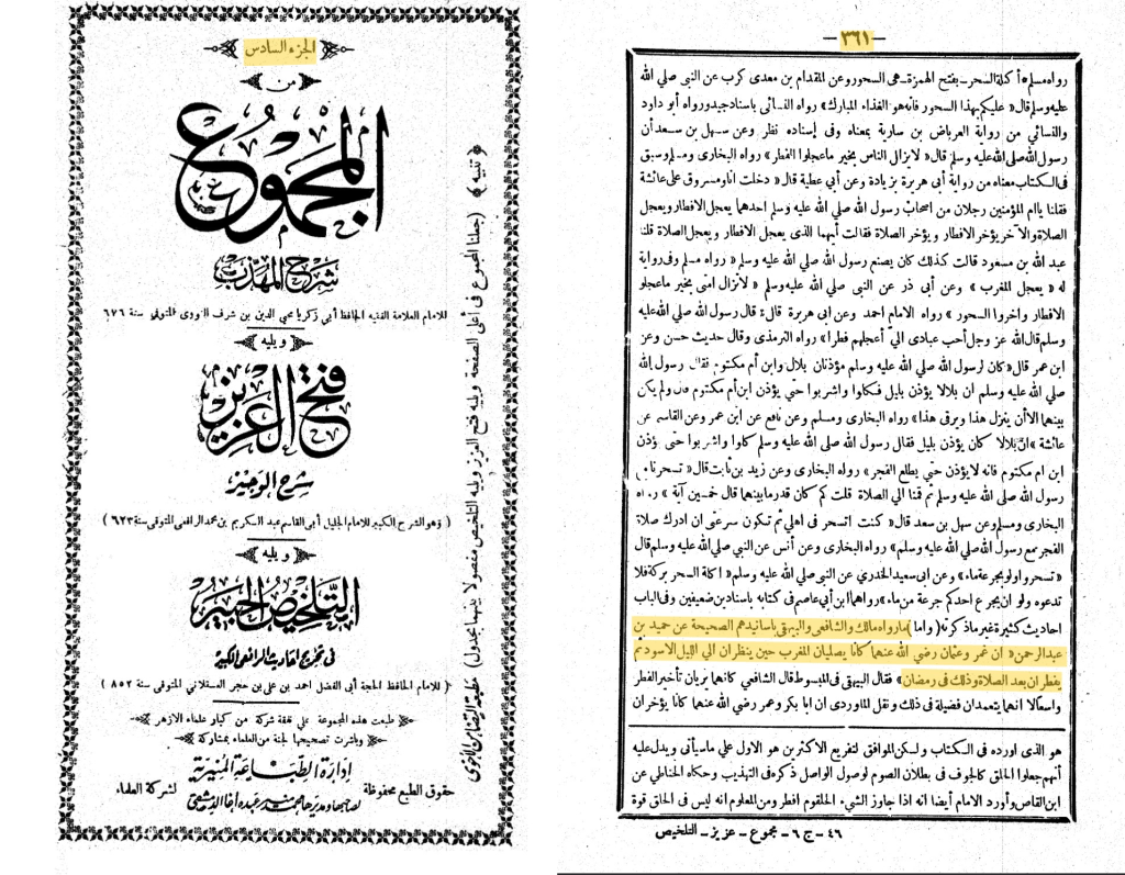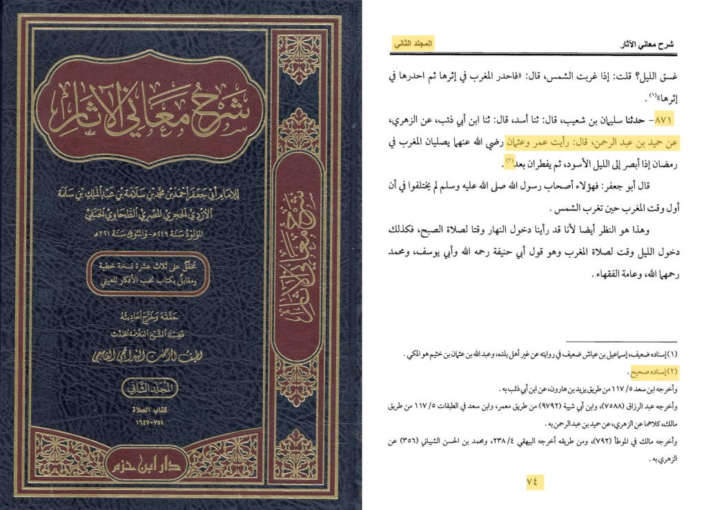 عَنِ ابْنِ شِهَابٍ، عَنْ حُمَيْدِ بْنِ عَبْدِ الرَّحْمَنِ، أَنَّ عُمَرَ بْنَ الْخَطَّابِ، وَعُثْمَانَ بْنَ عَفَّانَ، كَانَا يُصَلِّيَانِ الْمَغْرِبَ حِينَ يَنْظُرَانِ إِلَى اللَّيْلِ الأَسْوَدِ قَبْلَ أَنْ يُفْطِرَا ثُمَّ يُفْطِرَانِ بَعْدَ الصَّلاَةِ وَذَلِكَ فِي رَمَضَانَ .”
