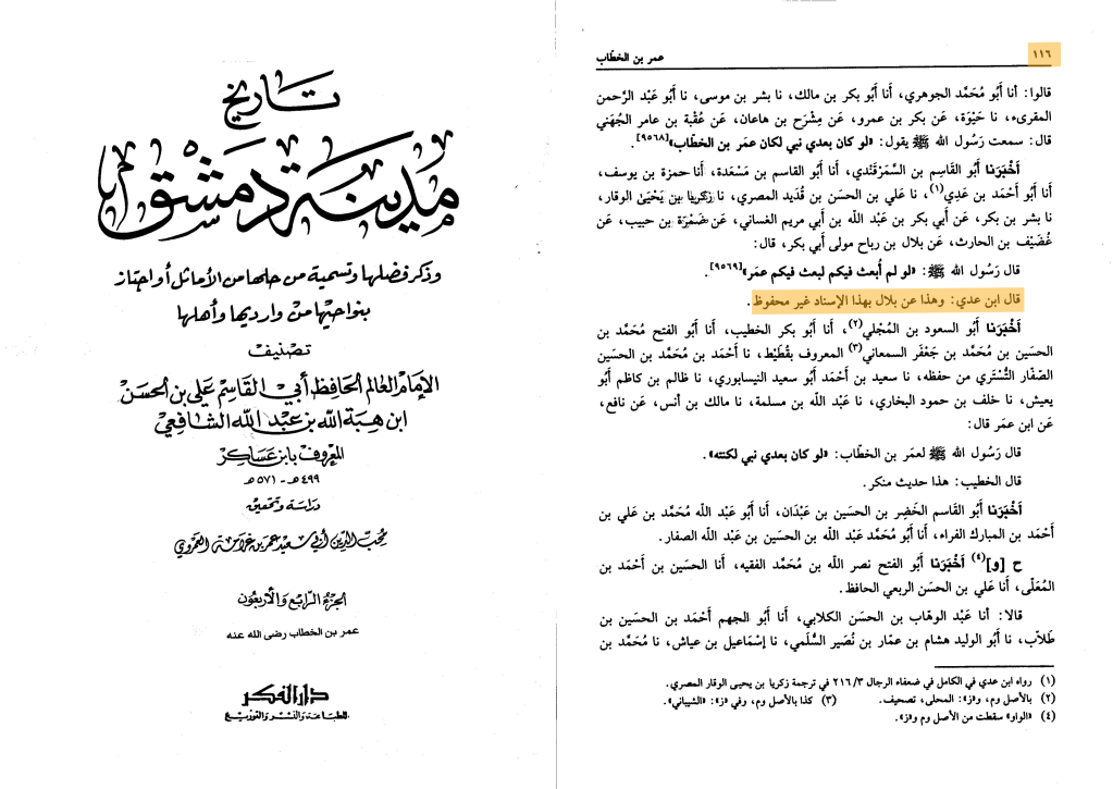 The Hadith ‘If I were not sent to you, Umar would’ve been sent.’ This was narrated by Ibn Adee’ on the authority of Bilal from the Prophet ﷺ. This Sanad is fabricated and it’s also narrated through another chain containing two unreliable narrators : Abd-Allah Ibn Waqid & Mishrah Ibn Ha’an.