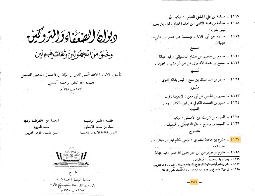 3) Allamah adh-Dhabhi placed him Diwan al-Du’afa page 387. A book that contains the narrators of the six canonical collections who have been identified for having weaknesses.