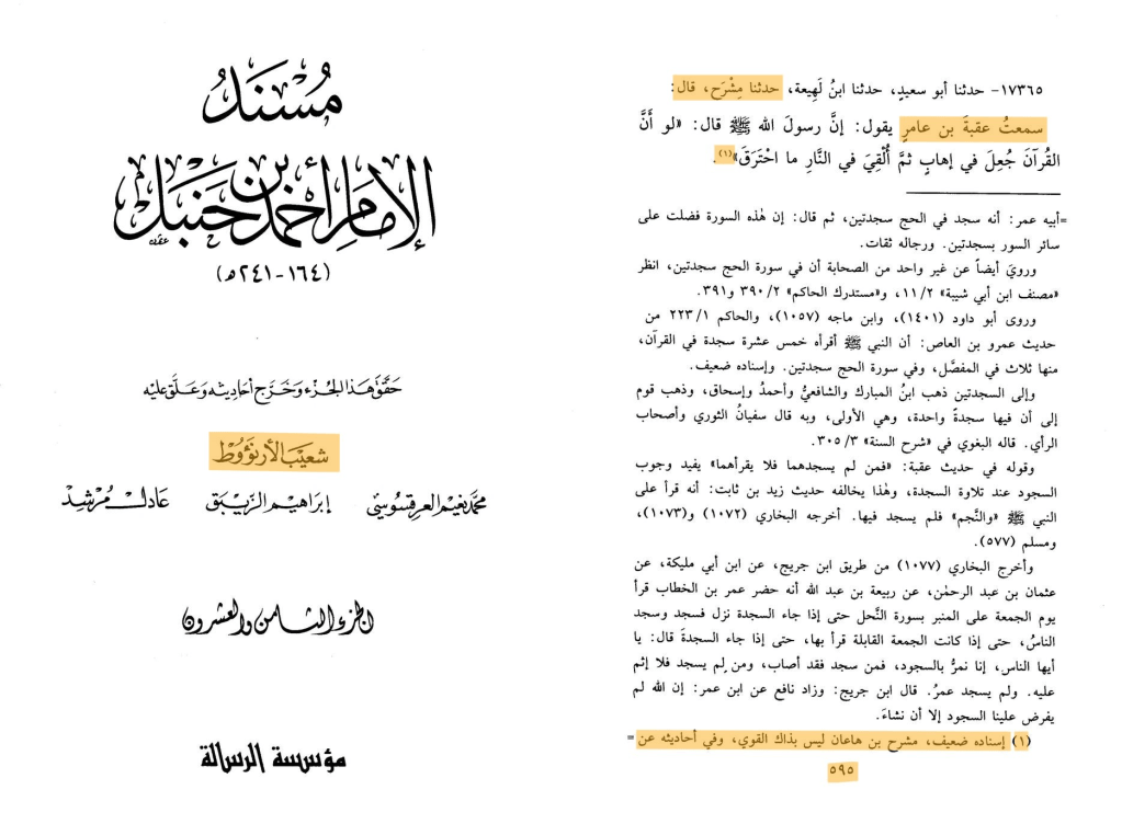 حدثنا حيوة بن شريح عن بكر بن عمرو المعافري عن مشرح بن هاعان عن عقبة بن عامر.. قلت: وهذا إسناد ضعيف؛ مشرح بن هاعان مختلف فيه، فقد وثقه جماعة من المتقدمين، وقال ابن حبان في الضعفاء يروي عن عقبة بن عامر أحاديث مناكير لا يتابع عليها، والصواب في أمره ترك ما انفرد من الروايات، والاعتبار بما وافق الثقات