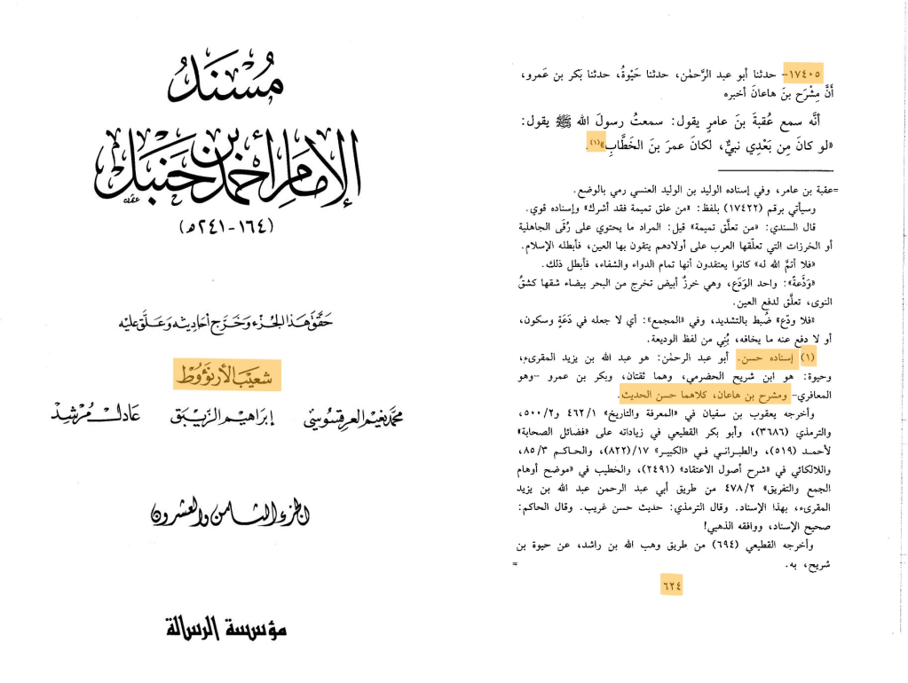 عن حيوة بن شريح عن بكر بن عمرو ، عن مشرح بن هاعان ، عن عقبة بن عامر قال: قال رسول الله ﷺ لو كان نبي بعدي لكان عمر