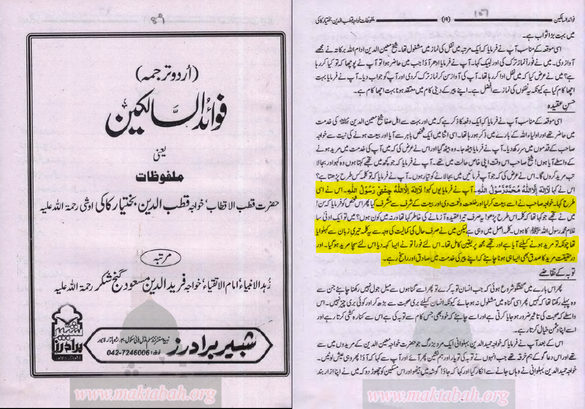 Moinuddin Chishti asked him ‘How do you recite the Kalimah?’ He replied ‘La Ilaha Ill Allah Muhammad Rasul-Allah.’ He said ‘Say like this, La ilaha Ill Allah Chishti Rasul-Allah.’ and he said as told.