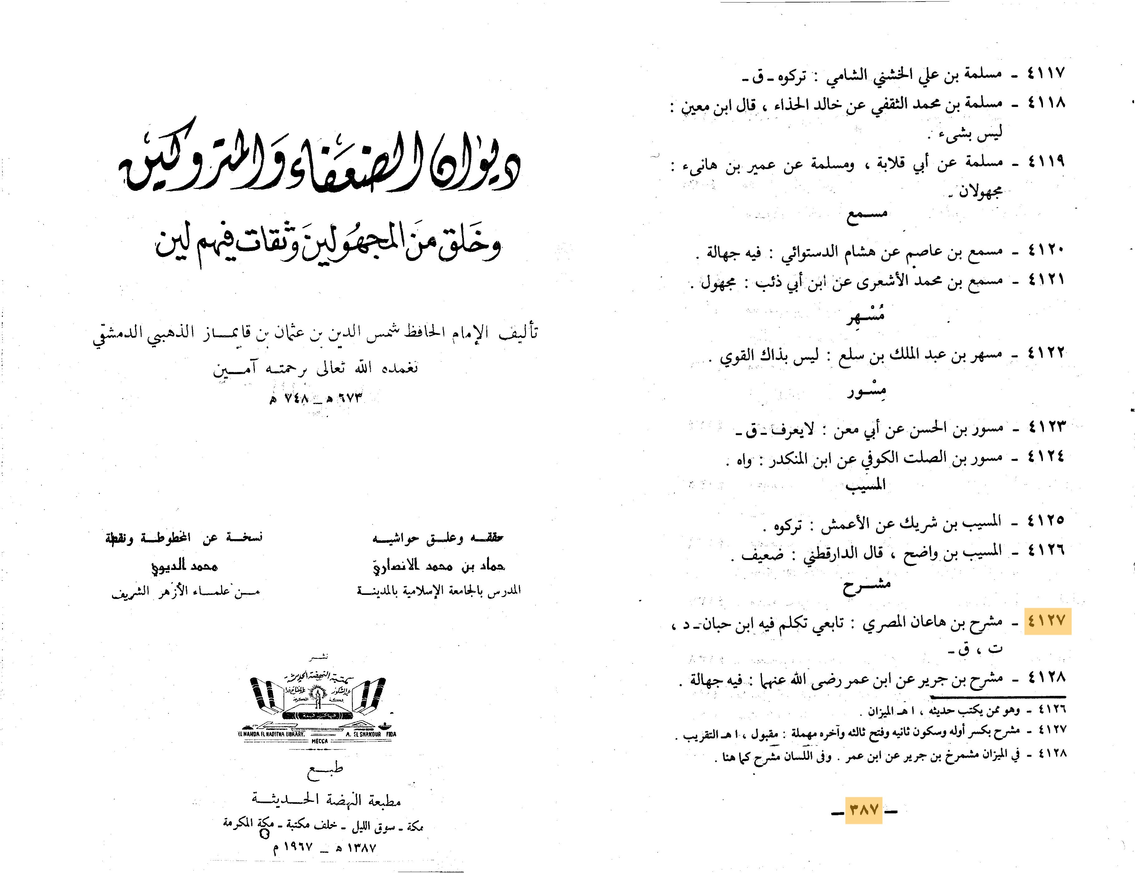 3) Allamah adh-Dhabhi placed him Diwan al-Du’afa page 387. A book that contains the narrators of the six canonical collections who have been identified for having weaknesses.