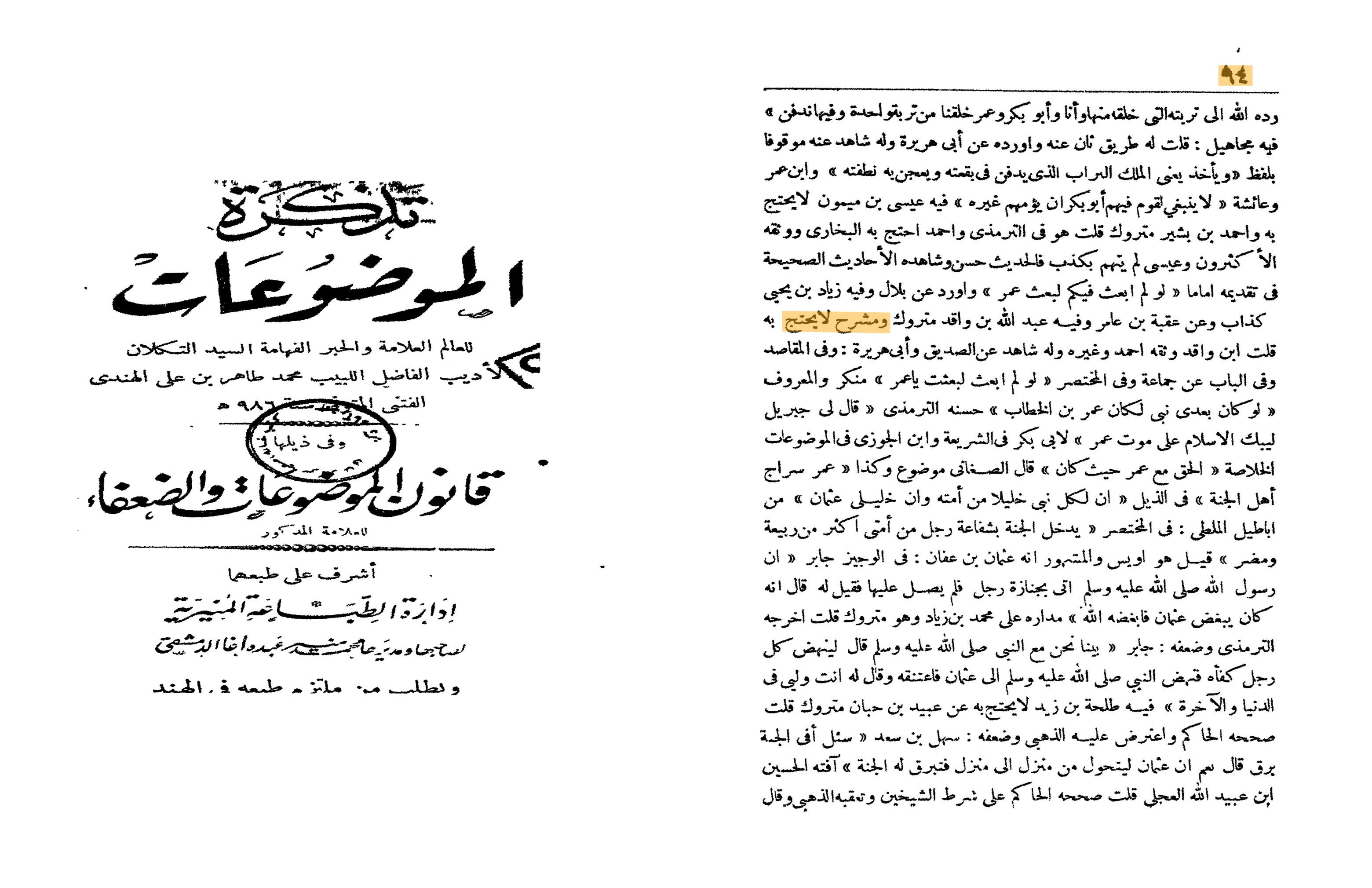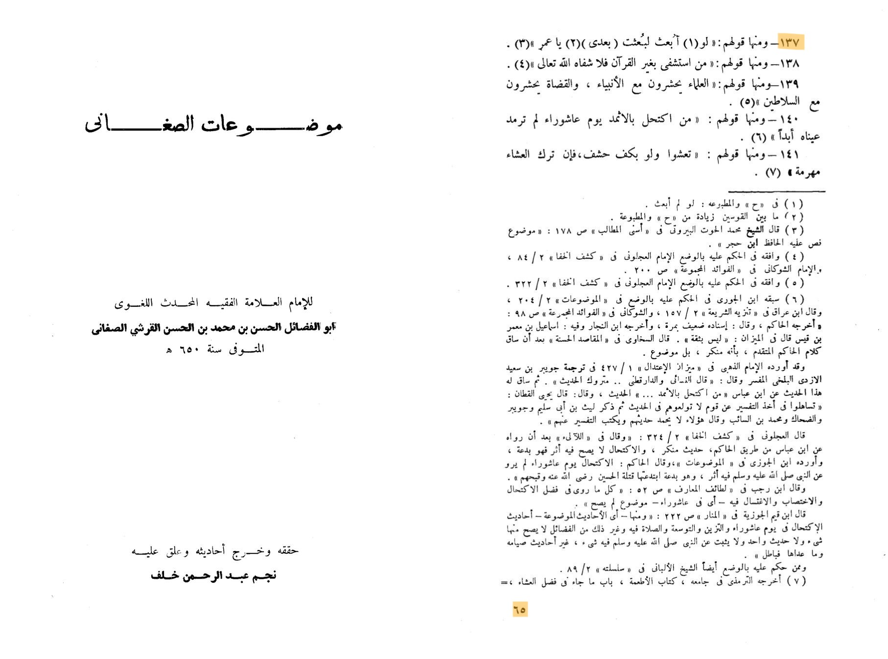 5) Radi al-Deen al-Saghani mentioned this Hadith in al-Mawduat (a collection of False and fabricated Hadith) on page 65