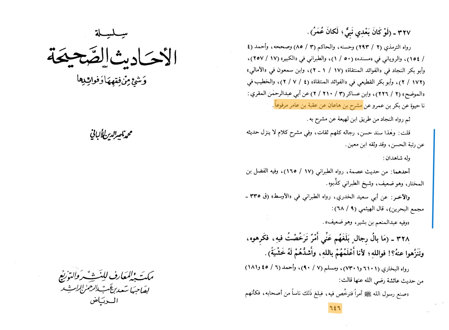 ولا يصح ما رُوي عن عقبة بن عامر قال: سمعت رسول اللَّه ﷺ يقول: “لو كان بعدي نبيٌّ لكان عمر بن الخطّاب”. قلت: فيه مشرح بن هاعان وإن كان ابنُ معين وثّقه إلّا أنّه يخالف ويخطئ ولذا قال ابن حبان في المجروحين يروي عن عقبة بن عامر أحاديث مناكير، لا يتابع عليها، والصّواب في أمره ترك ما ينفرد من الروايات، والاعتبار بما وافق الثقات فيها”. وهنا تفرّد بهذا الحديث، ولم أجد له متابعًا، وقد أكّد الترمذيّ أنه من حديث مشرح بن هاعان